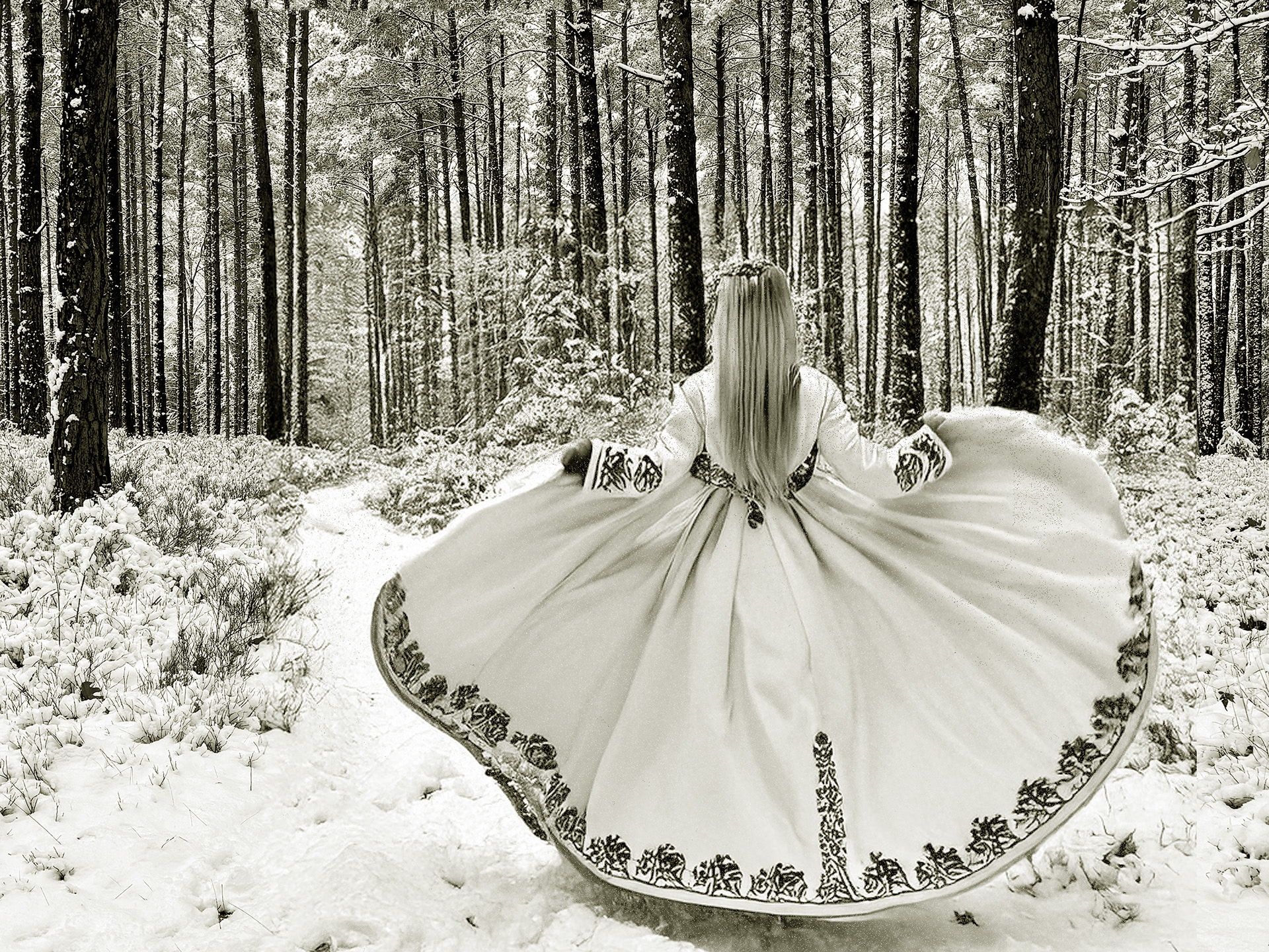 The forest story about Druids of Yore. In a forest draped in winter’s hush, ancient figures and fleeting spirits converge. Hooded Druids carry torchlight through snow-laden trees, witches and wizards stir the air above the branches, virgins walk beneath hovering doves, twin boys chase white rabbits, and an eagle watches over them all. At the gathering’s heart stands an old man with white wings—silent, knowing. Without words they meet; without trace they depart. The forest, itself a character, holds their secret beneath its pillowy clouds of snow.
