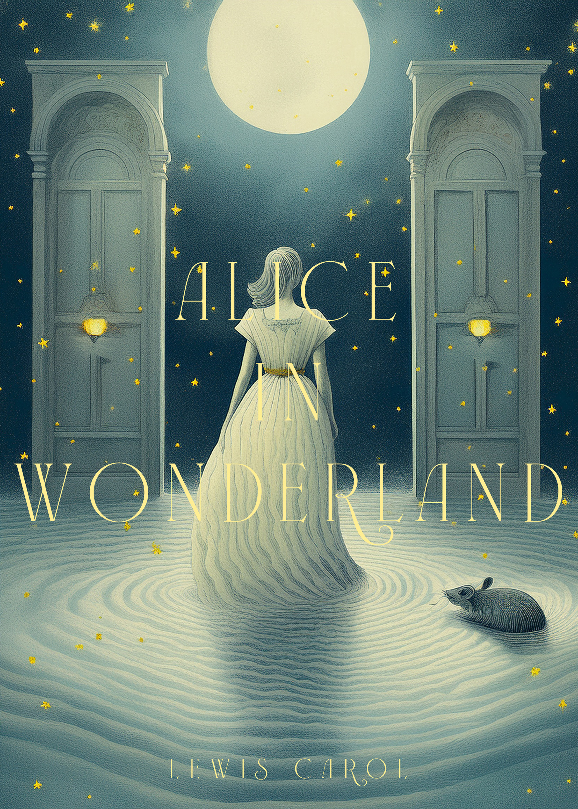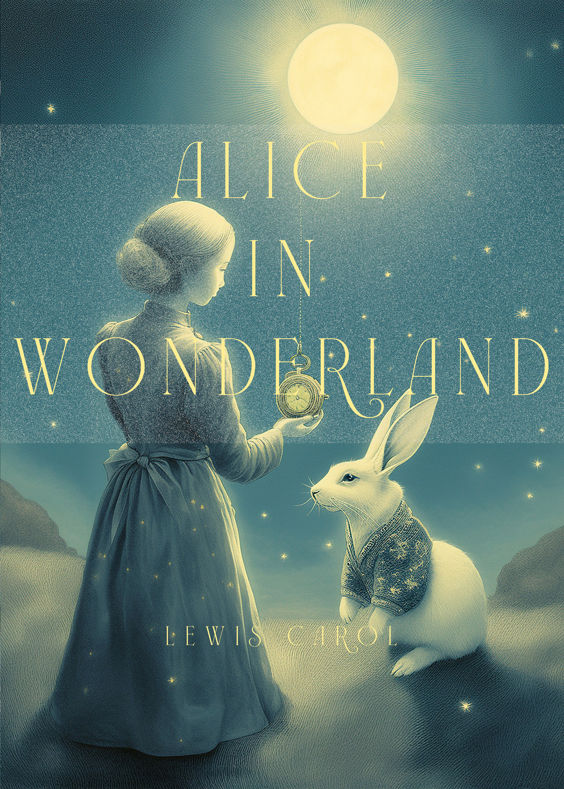 Cover illustration inspired by Lewis Carroll’s Alice’s Adventures in Wonderland (1865). In a sun-dappled meadow, Alice gazes in astonishment at a white rabbit with pink eyes, holding a pocket-watch and dressed in a tiny waistcoat. Time itself seems to shimmer around the watch, light bending in soft waves. The atmosphere is whimsical yet uncanny, like the first breath of a dream.
