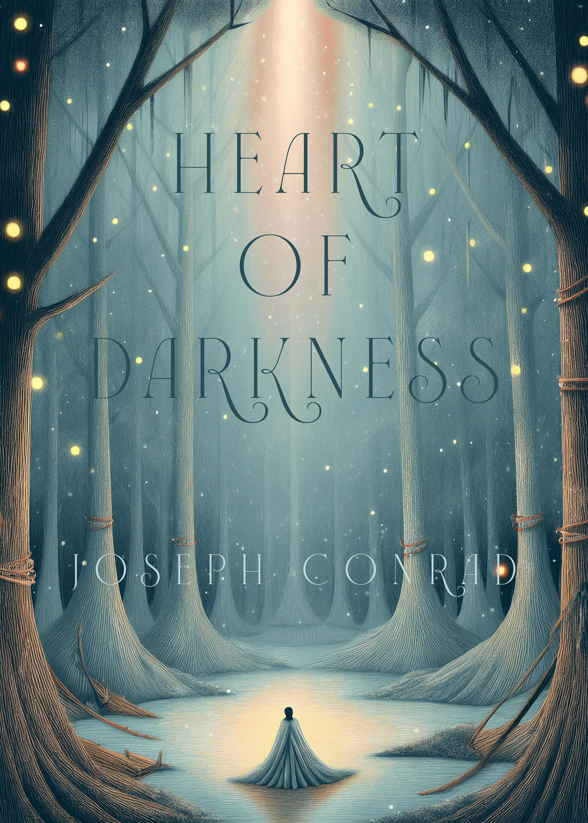 Cover illustration inspired by Joseph Conrad’s Heart of Darkness. A narrow steamer pushes slowly along a vast African river, its black smoke curling against a burning red sky. Dense jungle presses close on both sides, the trees rising like walls, their reflections shimmering in the dark water. The atmosphere is haunting, dreamlike, foreboding.