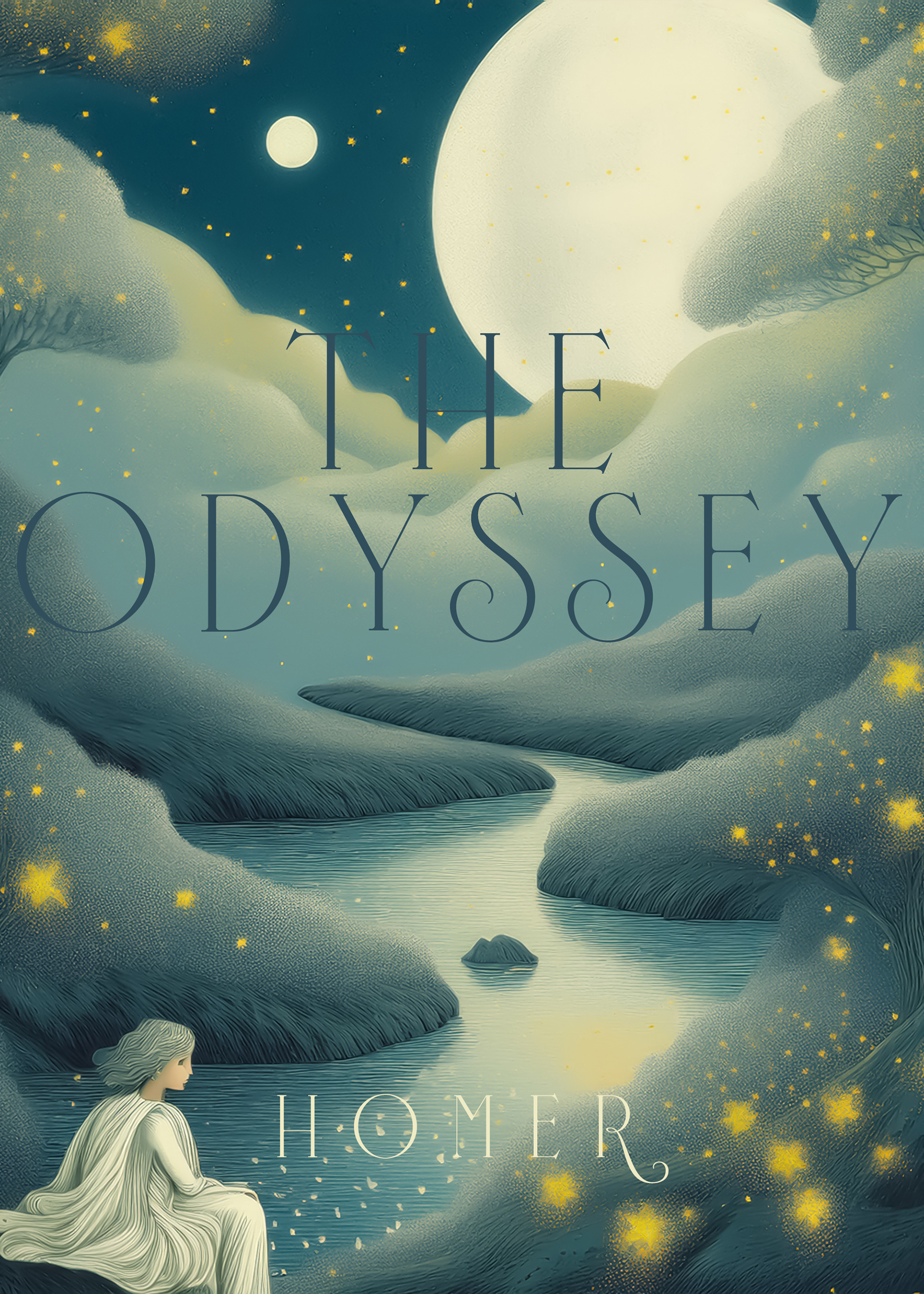 Cover illustration inspired by Homer’s The Odyssey. A ship with white sails glides across a gleaming sea, lashed to its mast stands Odysseus, resisting the pull of the Sirens’ song. On jagged rocks nearby, the Sirens shimmer — part-woman, part-bird, luminous and dangerous. The air is golden with enchantment, the sea dark with hidden peril.
