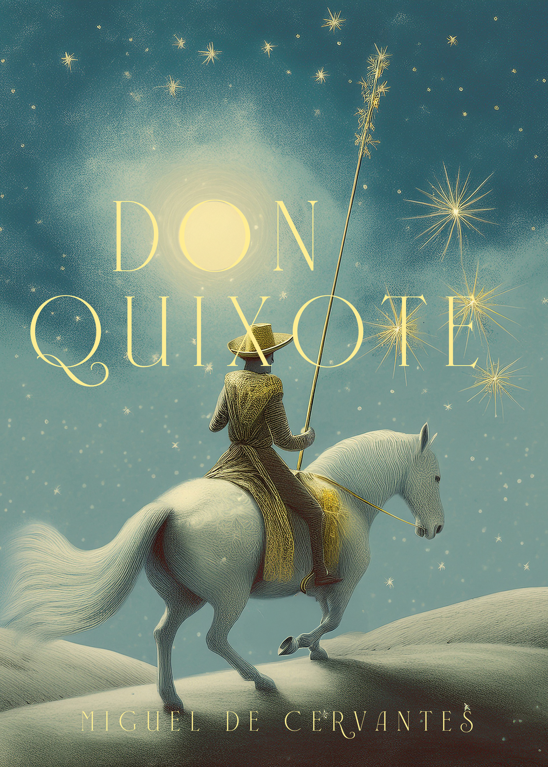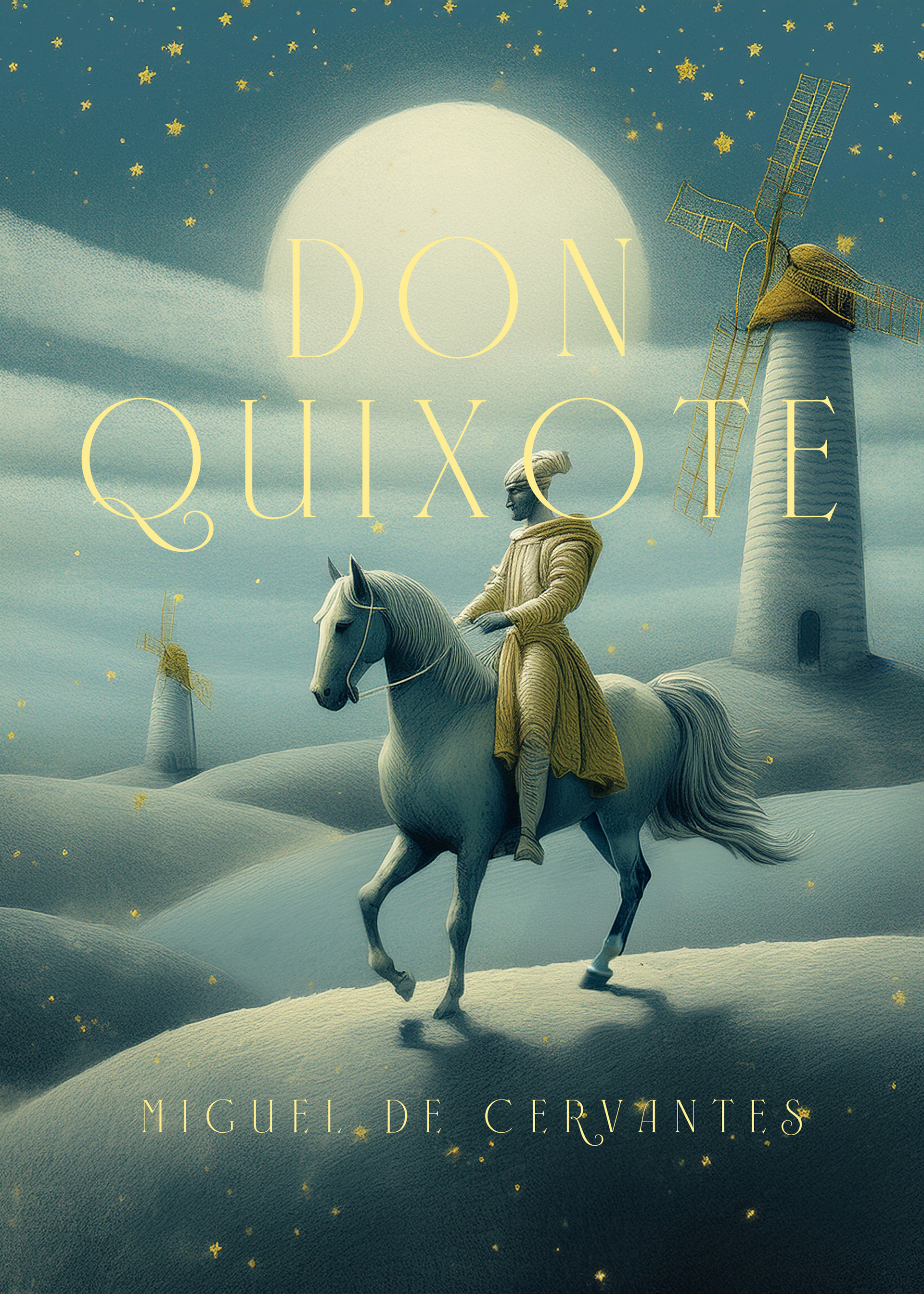 Cover illustration inspired by Miguel de Cervantes’ Don Quixote (1605). On a vast, barren plain beneath a dusky sky, Don Quixote rides his weary horse Rocinante, lance raised in defiance against towering windmills he mistakes for giants. Their massive arms turn slowly, casting long, monstrous shadows across the earth. Sancho Panza, on his mule, looks on in disbelief. The mood is dreamlike and tragic-heroic, a vision of noble folly, where imagination overwhelms reality.