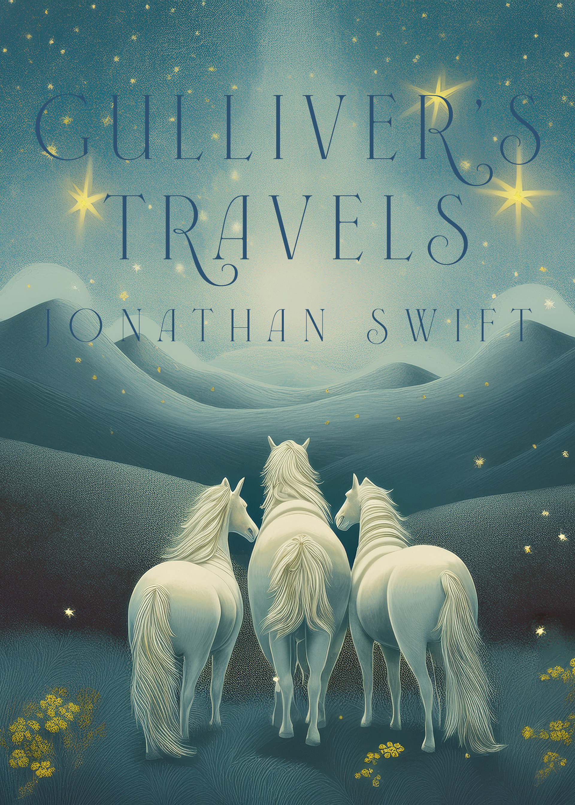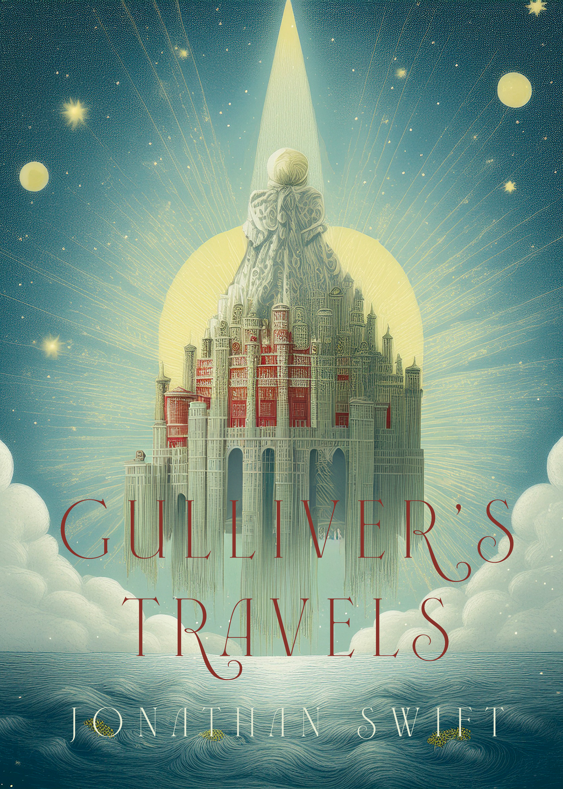 Cover illustration inspired by Jonathan Swift’s Gulliver’s Travels (1726). Gulliver lies upon a soft meadow by the shore, but his arms and legs are bound with hundreds of glimmering threads. Tiny Lilliputians, no taller than a handspan, swarm across his body like industrious sprites, their spears glinting in the dawn light. The scene is whimsical yet majestic, a mythical giant held captive by an enchanted people beneath the pastel sky.