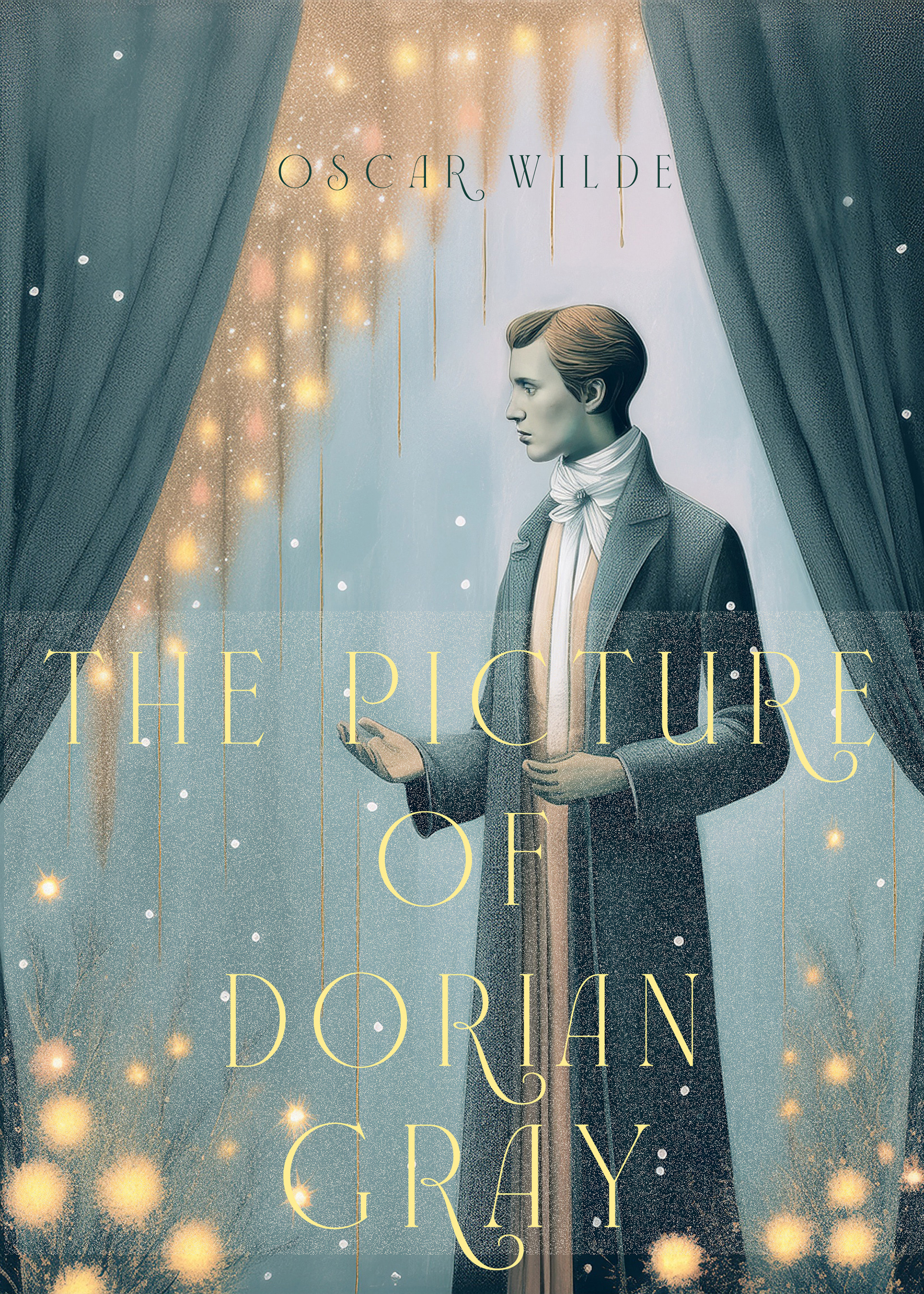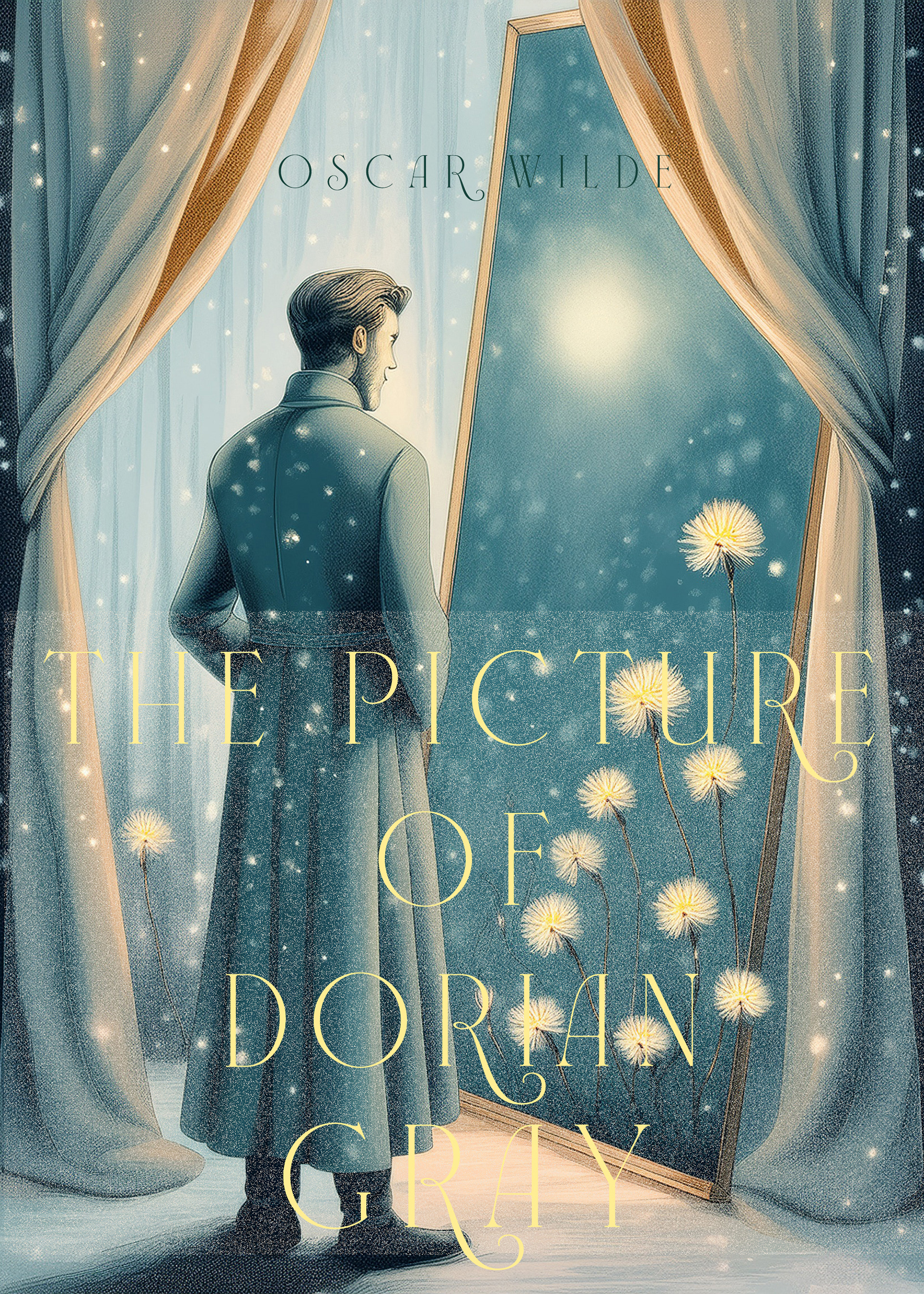 In a painter’s studio drenched in golden light, Dorian Gray stands before his newly finished portrait, radiant with eternal youth. The canvas seems alive, its colors shimmering as if breathing with a hidden soul. Shadows gather in the corners, mingling with the scent of oils and flowers. The mood is luminous and spellbound, a fairytale moment of beauty transfigured into enchantment.
