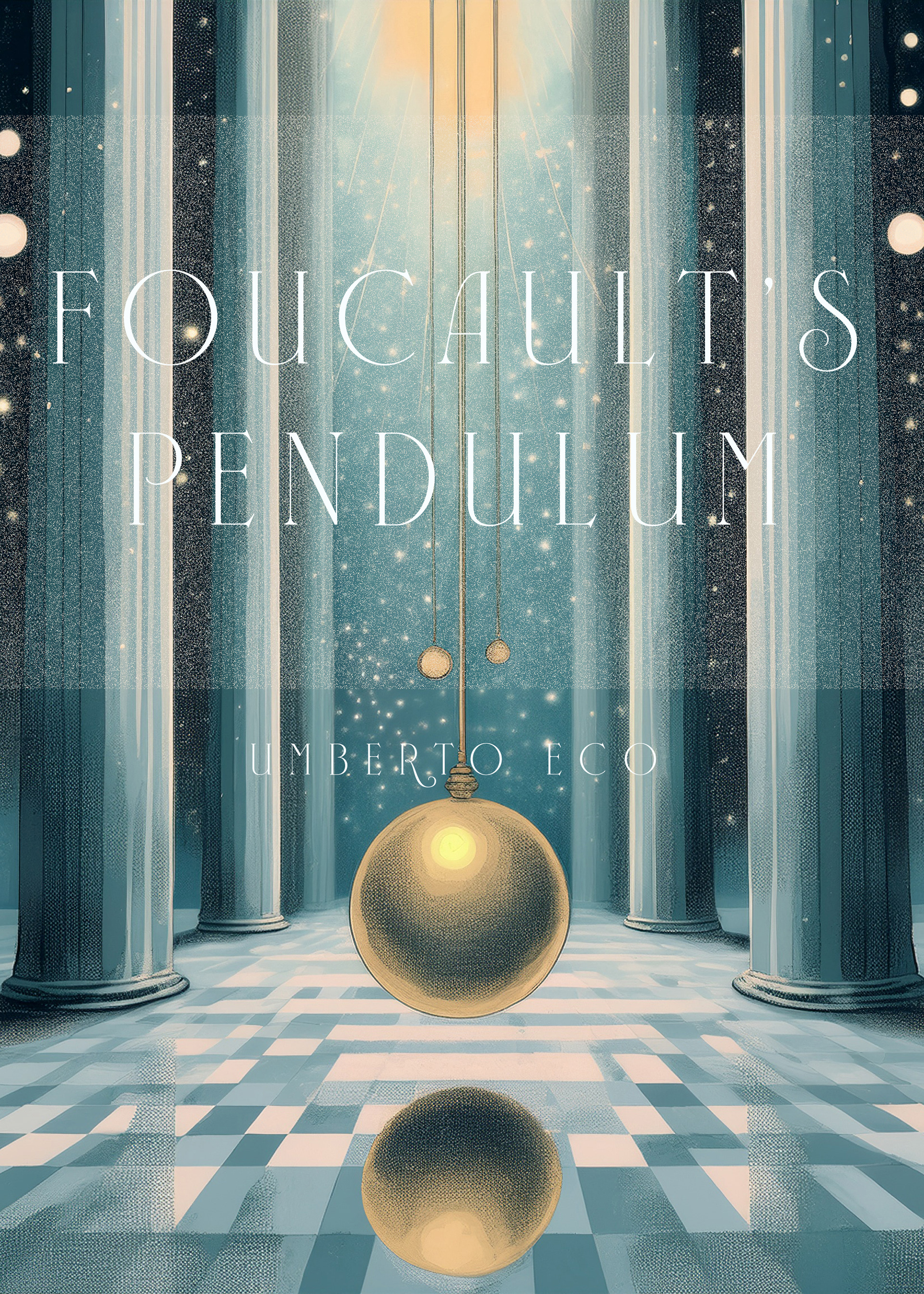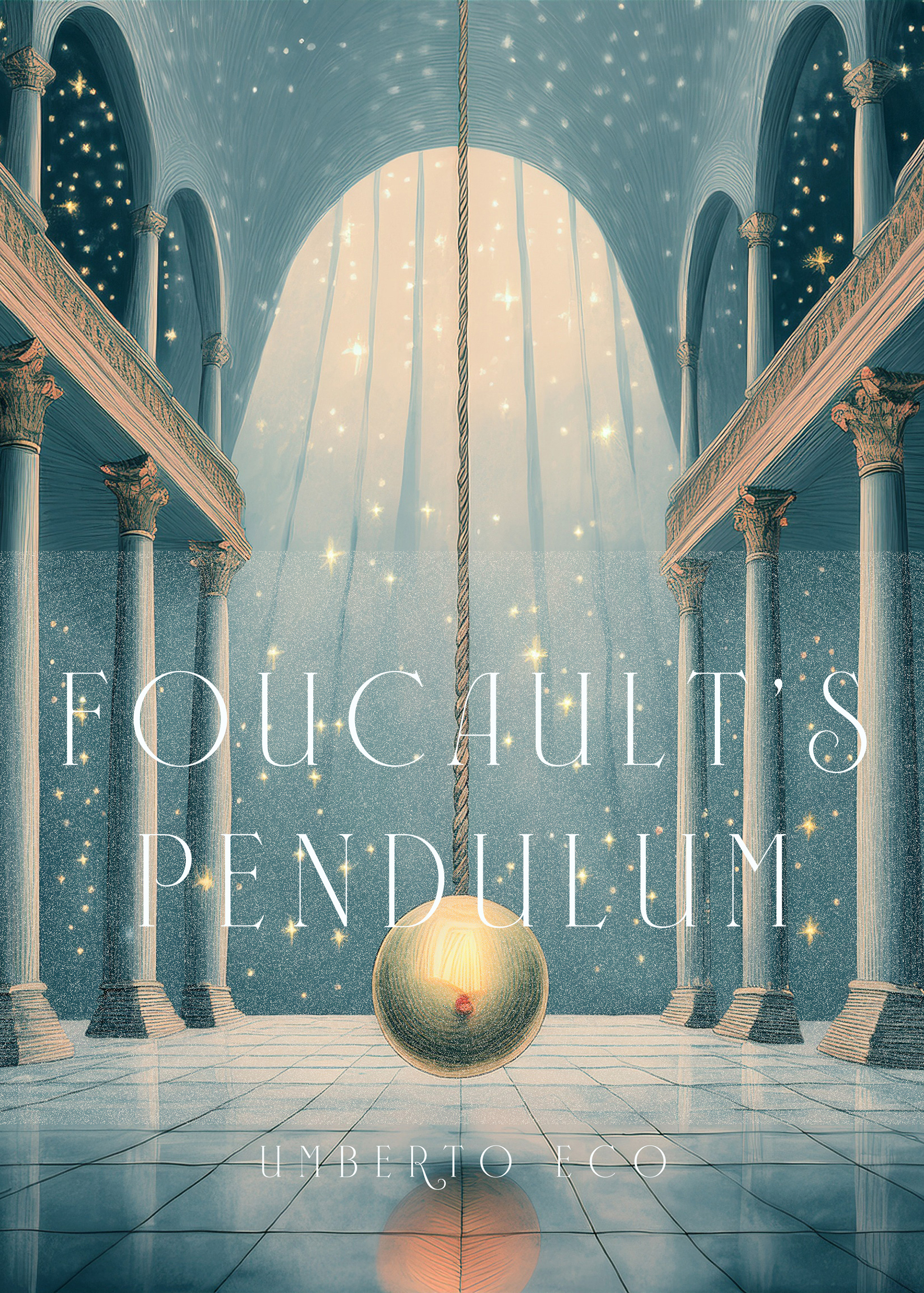 Cover illustration inspired by Umberto Eco’s Foucault’s Pendulum (1988). In a cavernous, cathedral-like hall, a golden pendulum sphere hangs from an endless wire, descending from above like a celestial thread. Its swing is slow, luminous, breathing with the rhythm of the cosmos. Dust and light drift in the silence, marble floors reflecting its arc. The atmosphere is ethereal, timeless, blending the scientific and the mystical in a single enchanted vision.