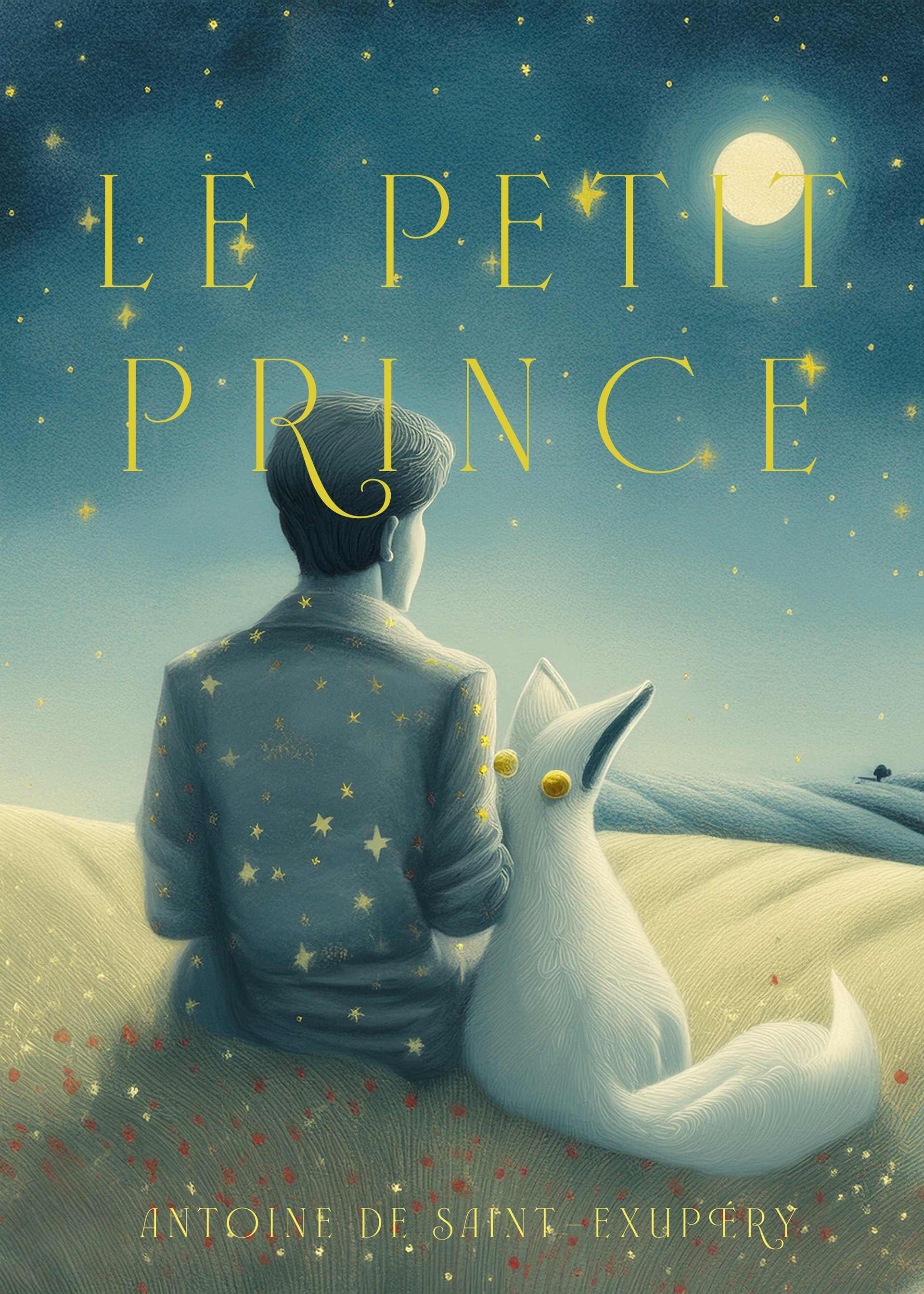 Cover illustration inspired by Antoine de Saint-Exupéry’s Le Petit Prince (1943), Chapter XXI. The Little Prince sits with the Fox in a golden wheat field at sunset, the moment the Fox whispers his secret: ‘On ne voit bien qu’avec le cœur. L’essentiel est invisible pour les yeux.’ Atmosphere of tenderness and luminous stillness, the invisible bond between them glowing softly, blending reality and dream.