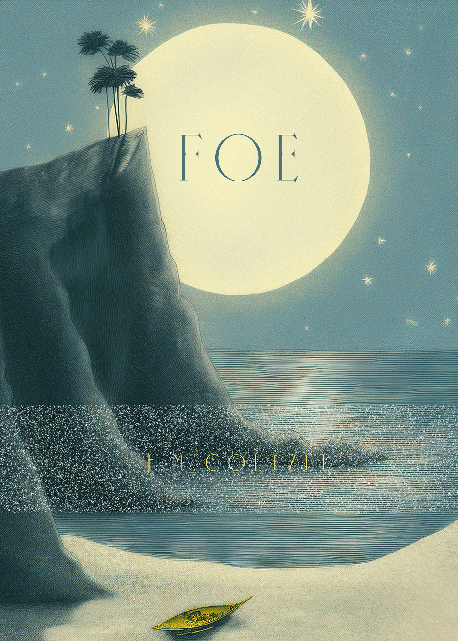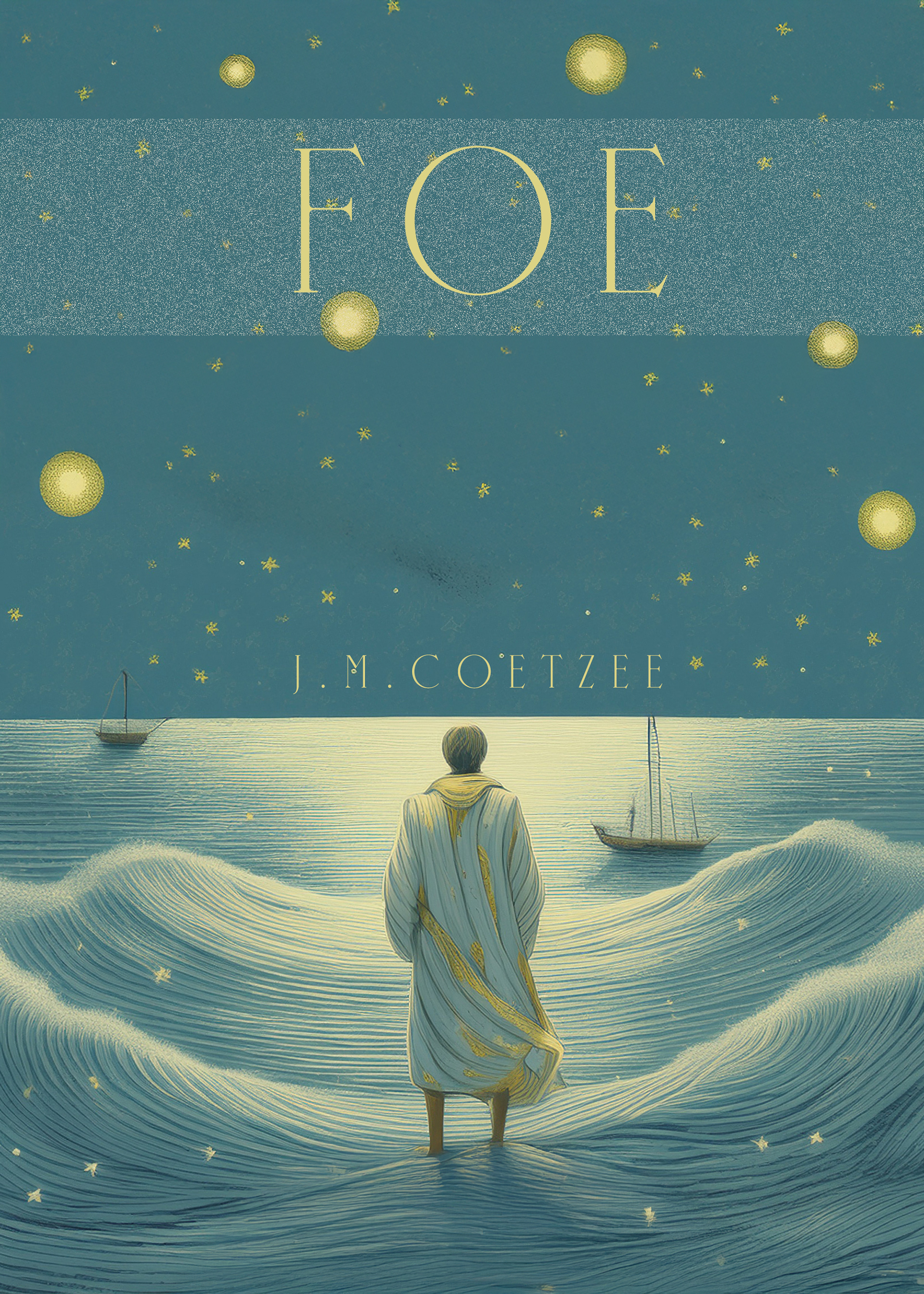 Cover illustration inspired by J. M. Coetzee’s Foe (1986). In the moonlit ruins of the island, Friday stands by the water’s edge, gazing into the dark sea. His mouth is closed, his silence echoing louder than speech. Around him, the waves gleam with spectral light, and shadows of drowned ships drift beneath the surface. The moment feels solemn, uncanny, as if the ocean itself carries unspoken stories.