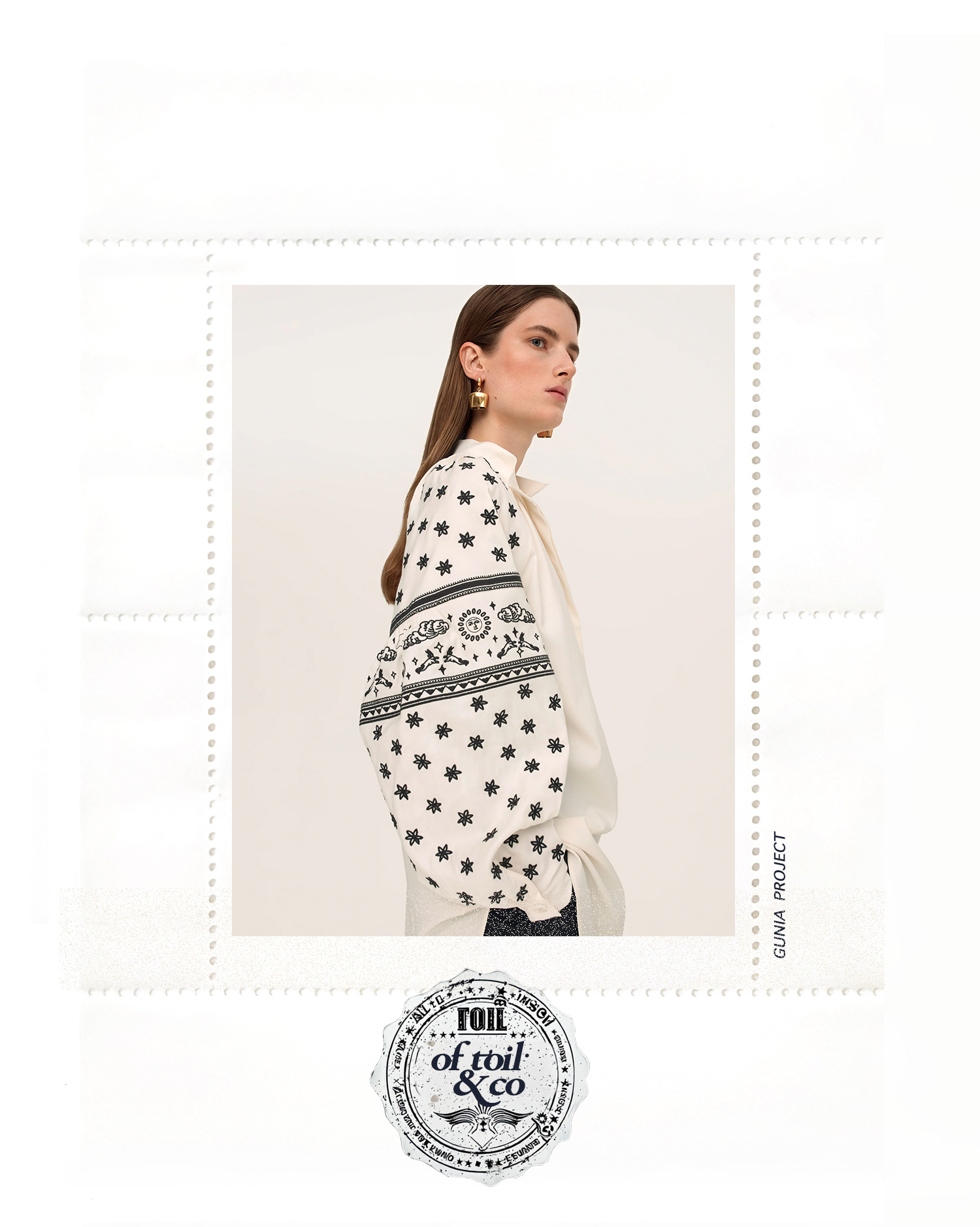 Afterwards came the first collections: silk scarves inspired by embroidered towels from the archive of the Ivan Honchar Museum, and a clothing and accessories line, including a scarf inspired by vytynanka, a traditional paper-cutting technique. Over time, it became one of GUNIA’s most recognisable items.