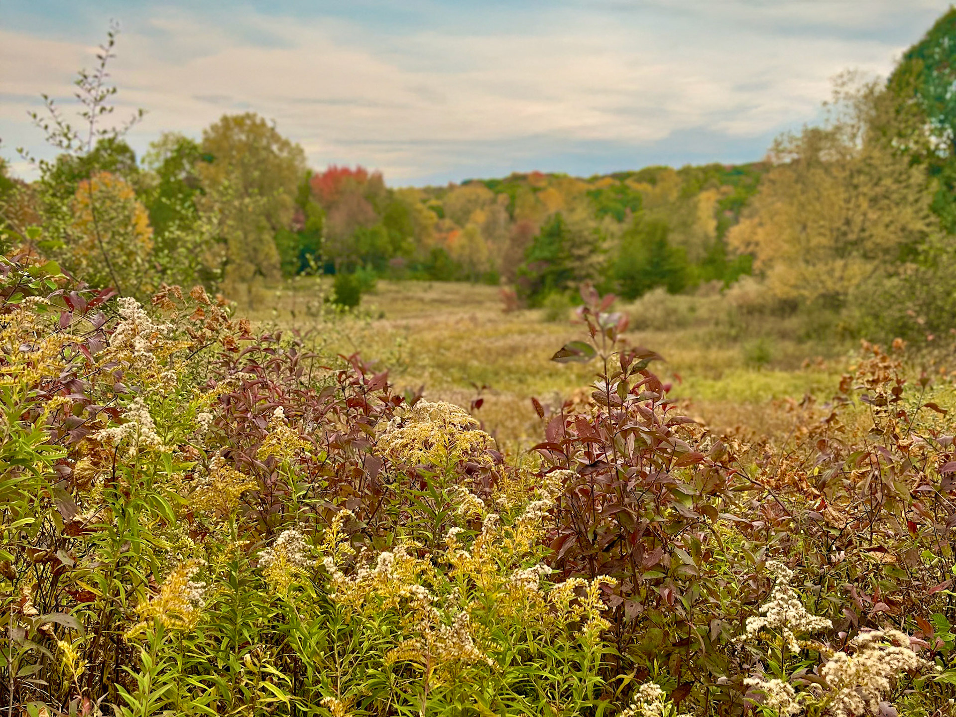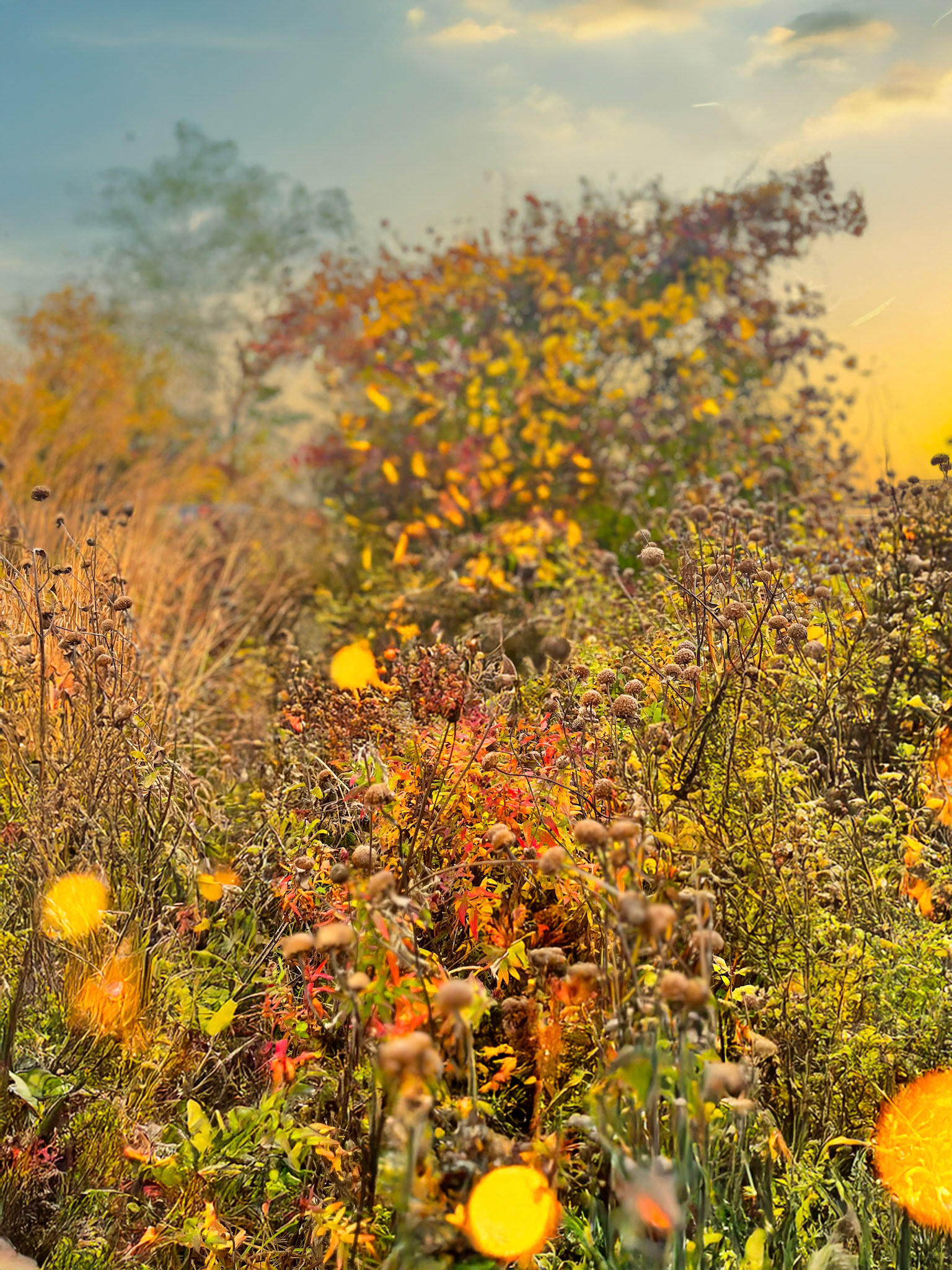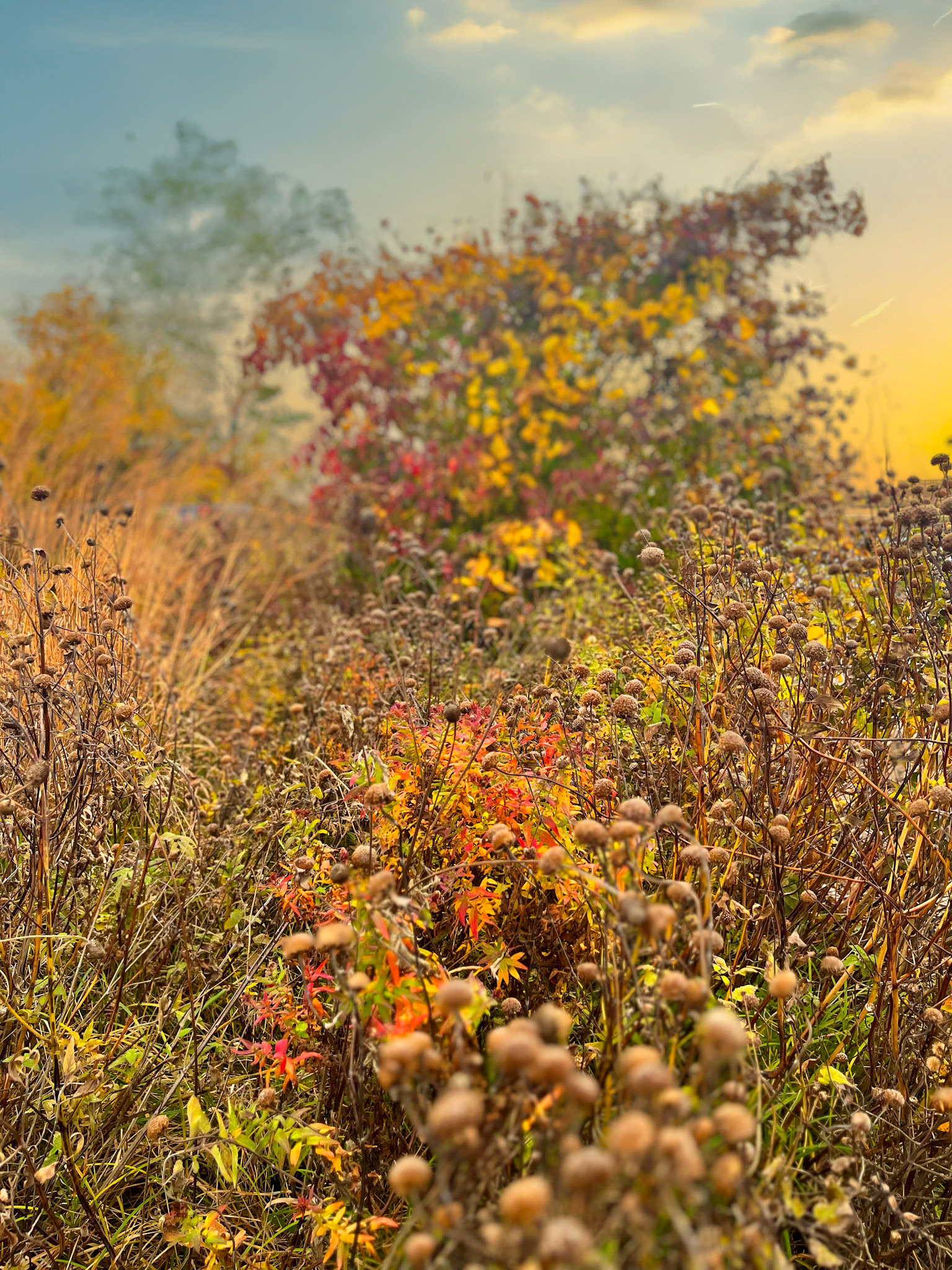 A cross the parklands of Lower Michigan, late summer drifts into early autumn with a kind of quiet extravagance. Meadows swell with color as the season reaches its final, generous bloom—bronzed seedheads standing beside pockets of foliage that flare suddenly into reds, ambers, and molten golds. The air itself seems softened by light, turning each scene into a slow, incandescent wash of warmth.