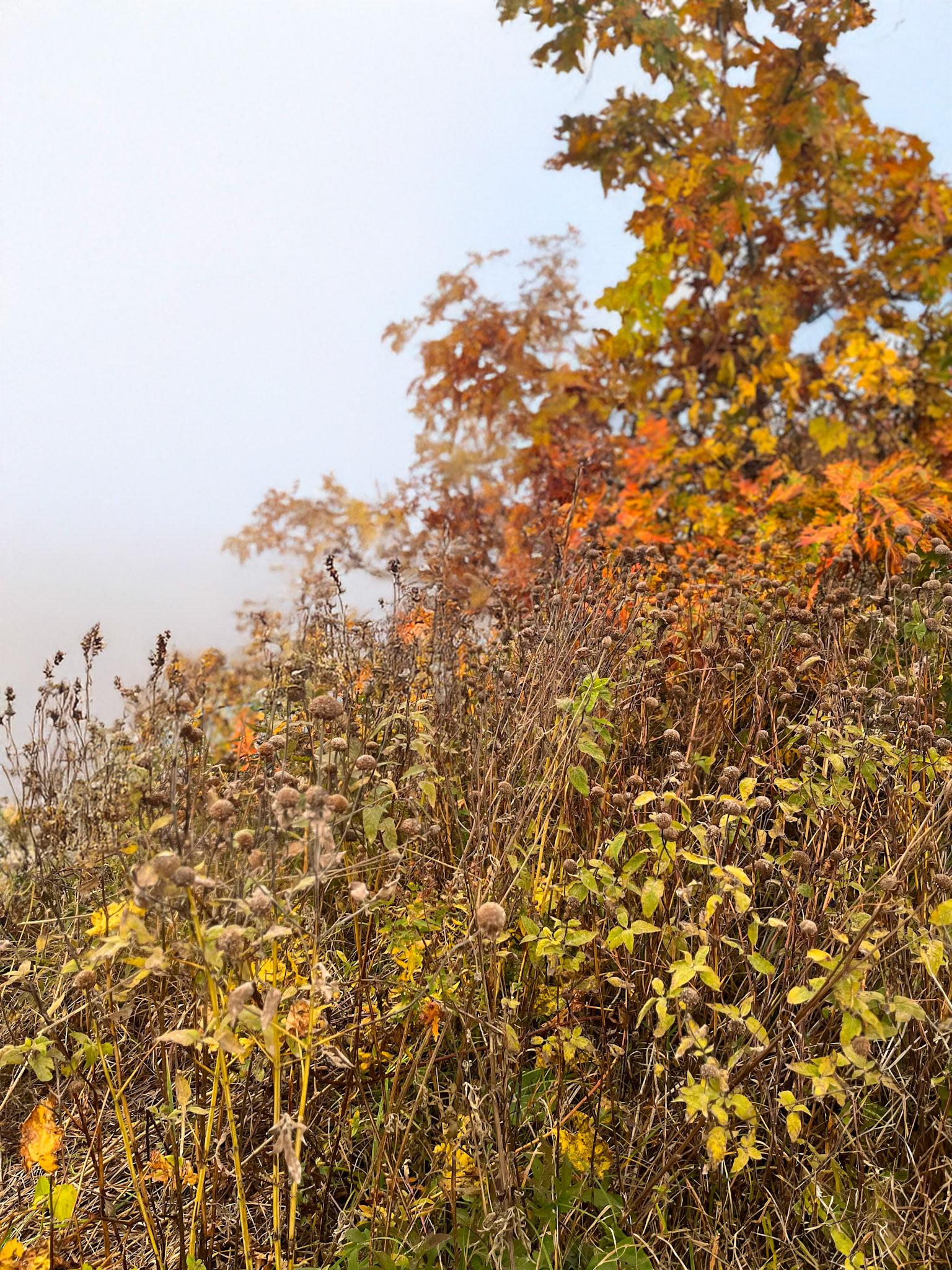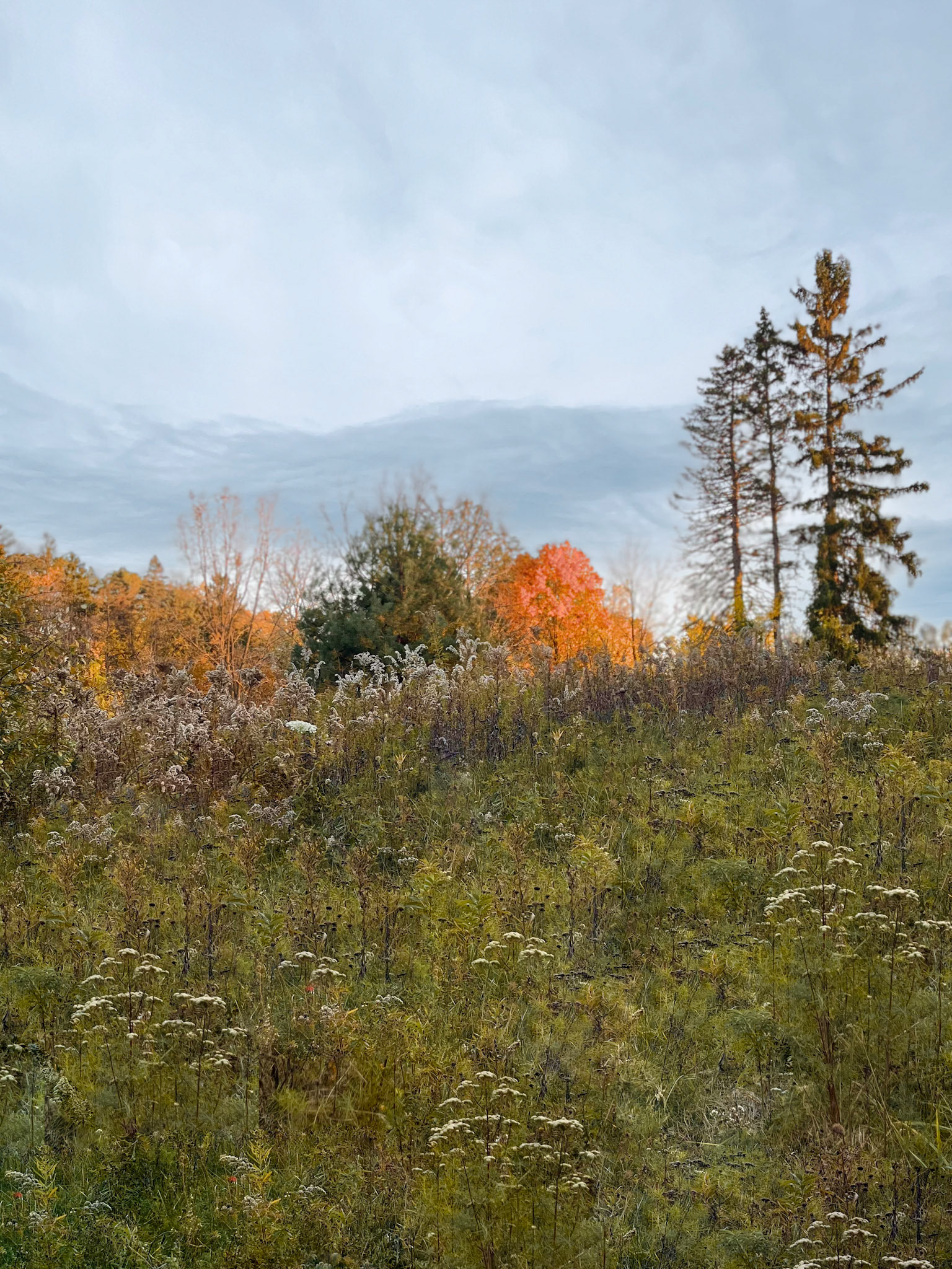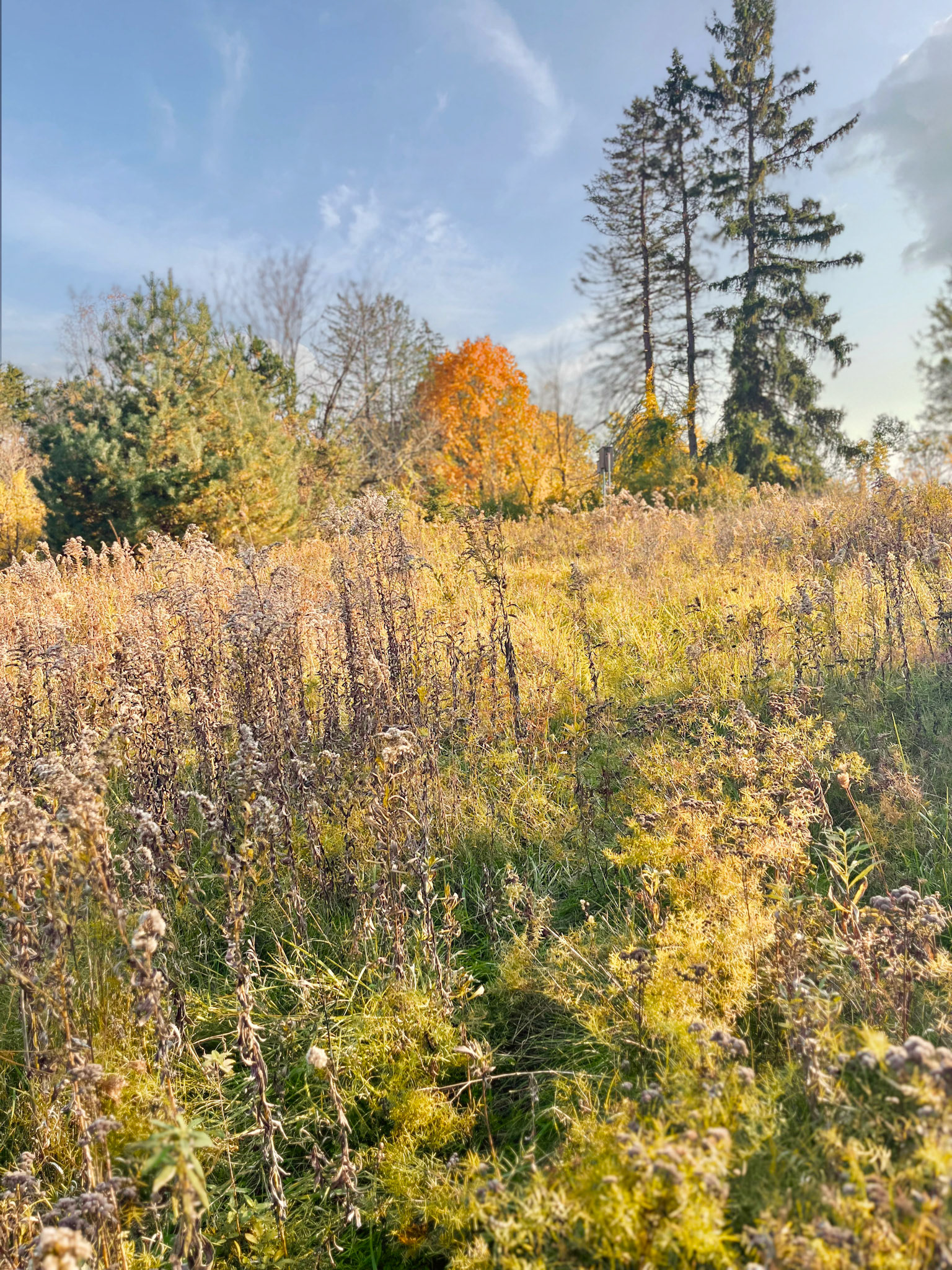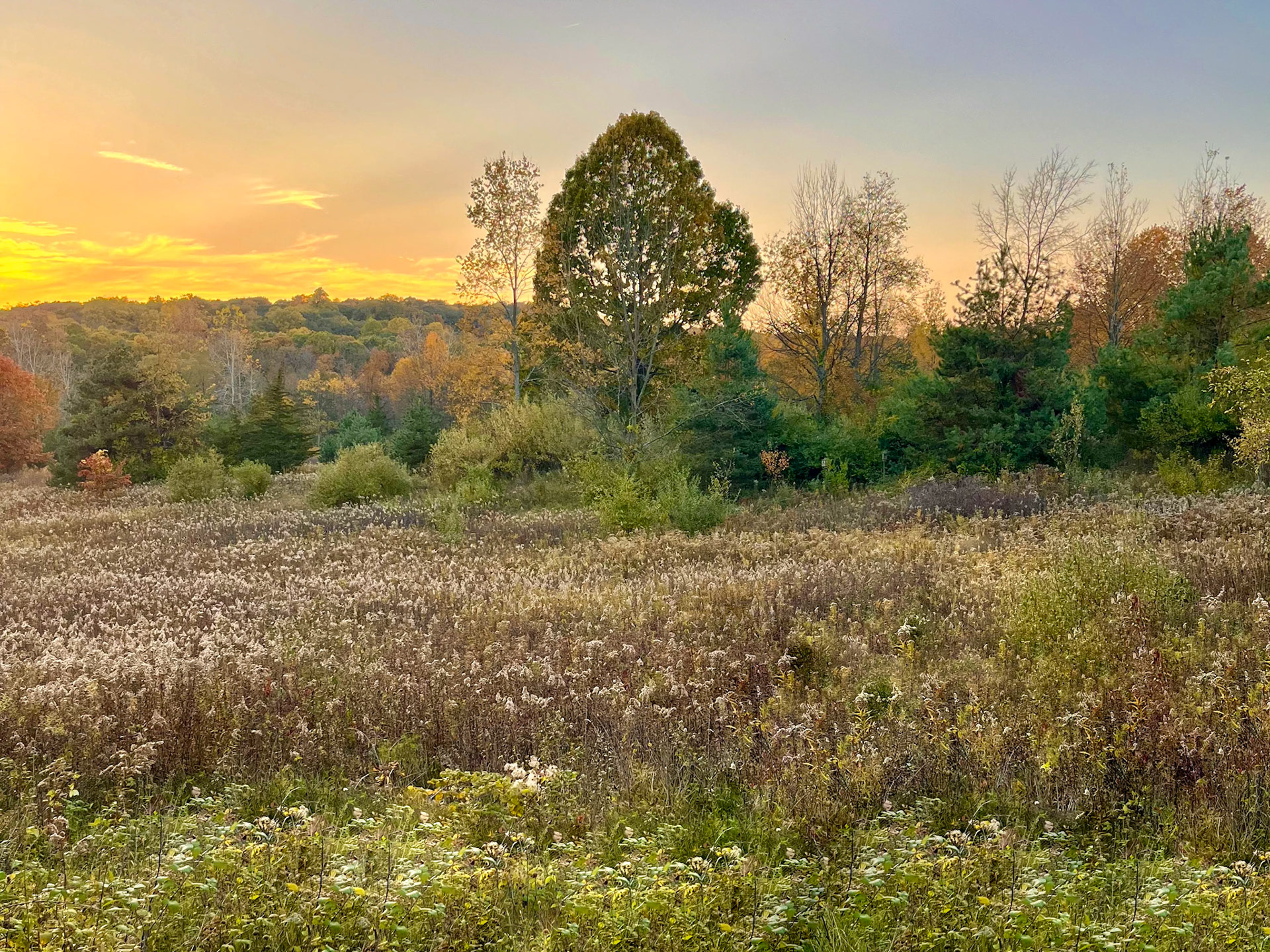 A cross the parklands of Lower Michigan, late summer drifts into early autumn with a kind of quiet extravagance. Meadows swell with color as the season reaches its final, generous bloom—bronzed seedheads standing beside pockets of foliage that flare suddenly into reds, ambers, and molten golds. The air itself seems softened by light, turning each scene into a slow, incandescent wash of warmth.