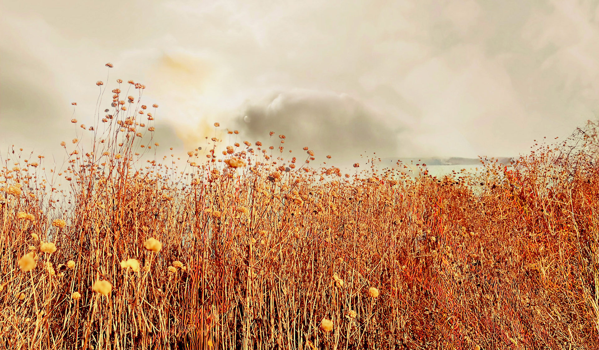 These landscapes carry a distinct duality. In some meadows, the grasses rise in tawny, textural waves—mature, sun-hardened, and touched by the first hints of seasonal decline. In others, the blooms remain lush and saturated, petals lacquered in purples and vivid greens that shimmer as if lit from within. Wind moves through everything, gentle but insistent, creating an ever-shifting mosaic of form and hue. Nothing sits still for long; color and structure are in constant conversation.
