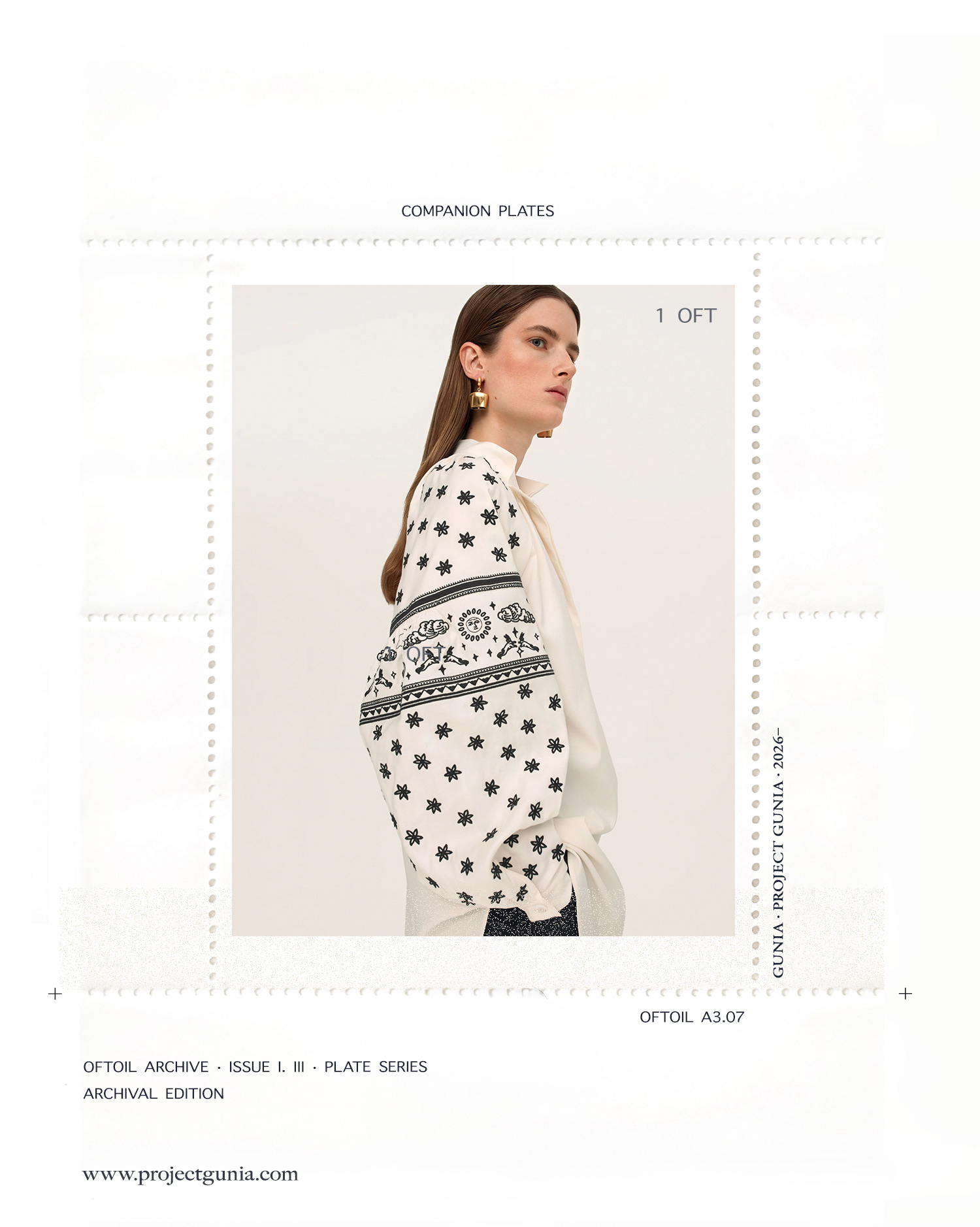 Afterwards came the first collections: silk scarves inspired by embroidered towels from the archive of the Ivan Honchar Museum, and a clothing and accessories line, including a scarf inspired by vytynanka, a traditional paper-cutting technique. Over time, it became one of GUNIA’s most recognisable items.
