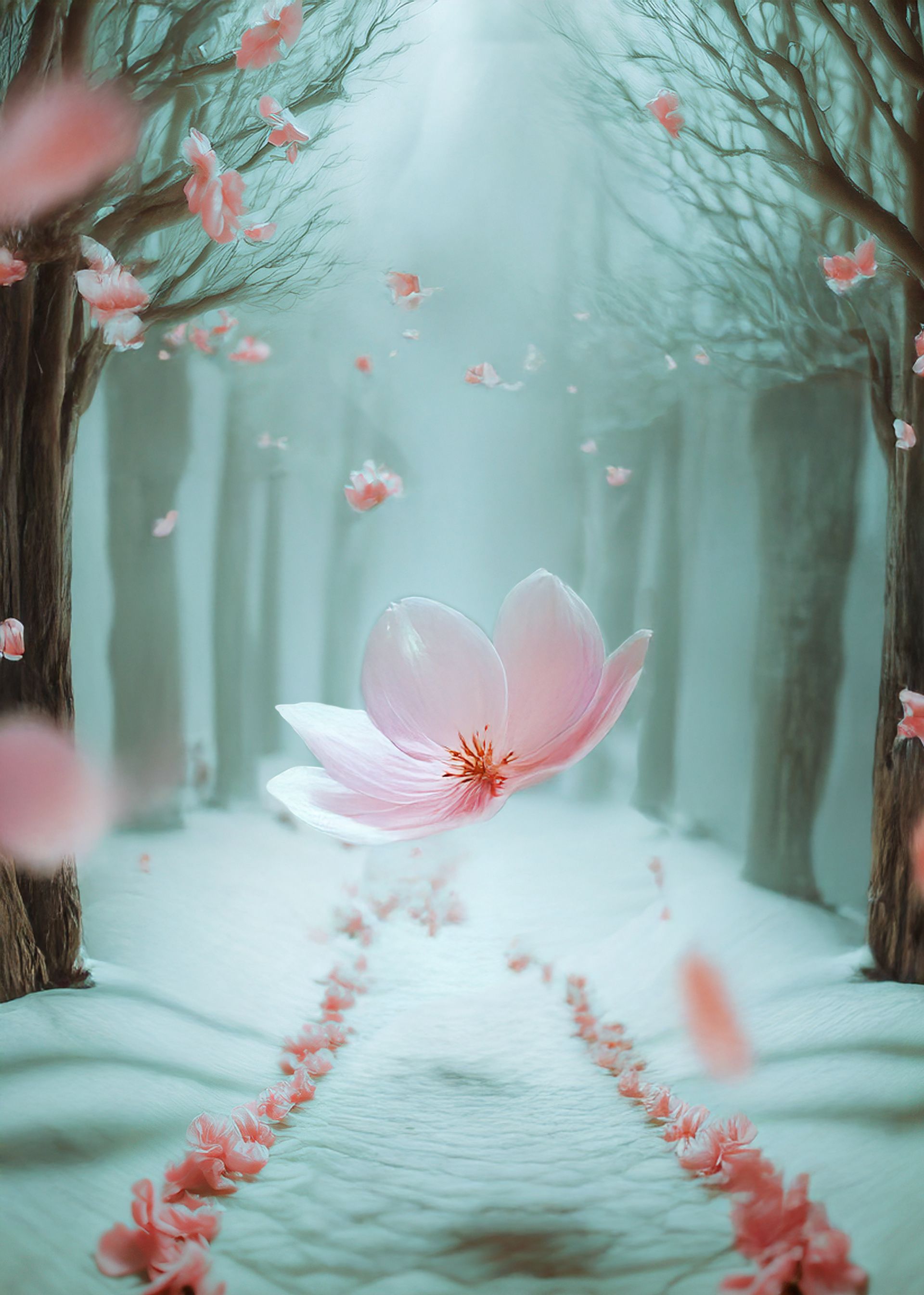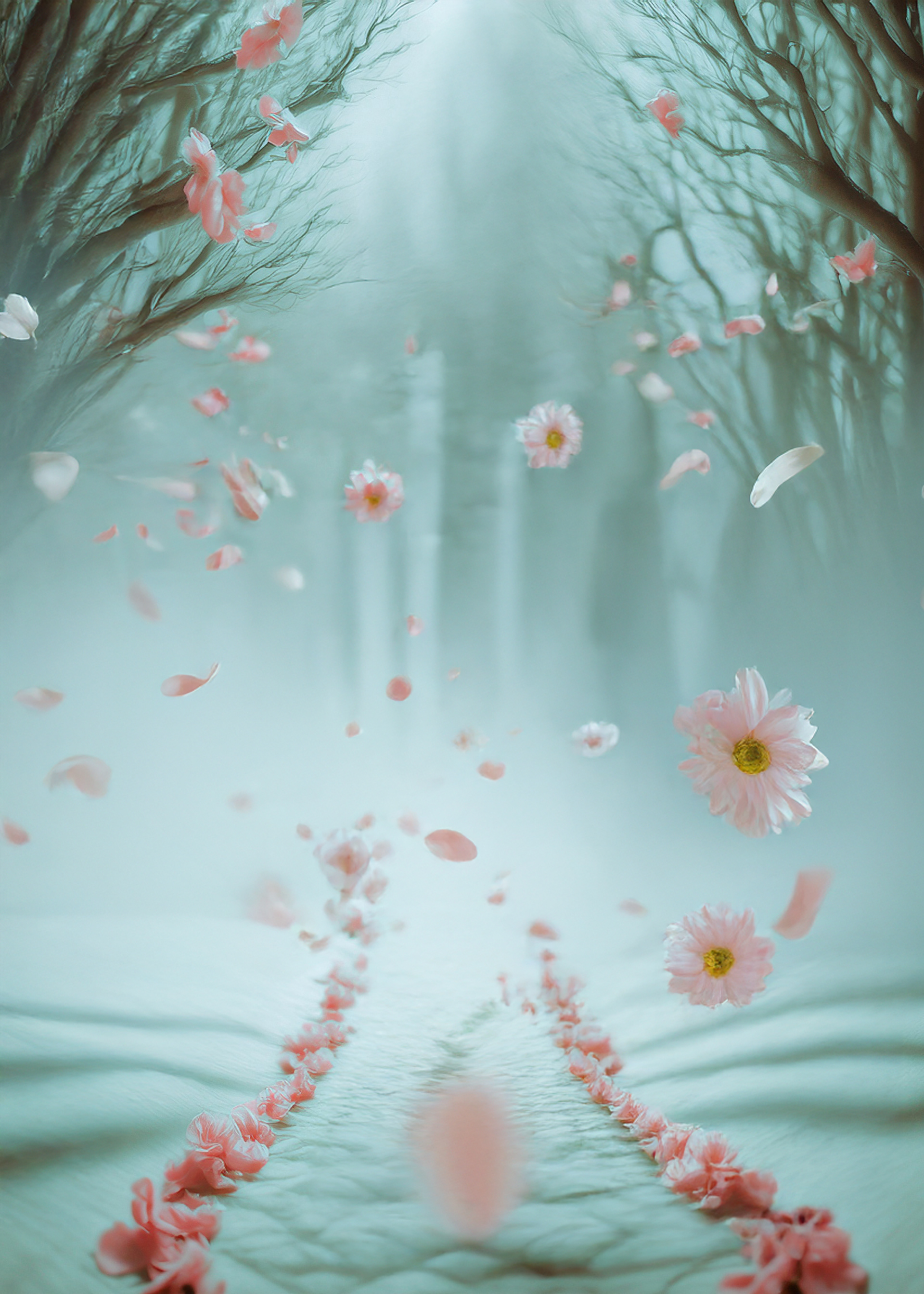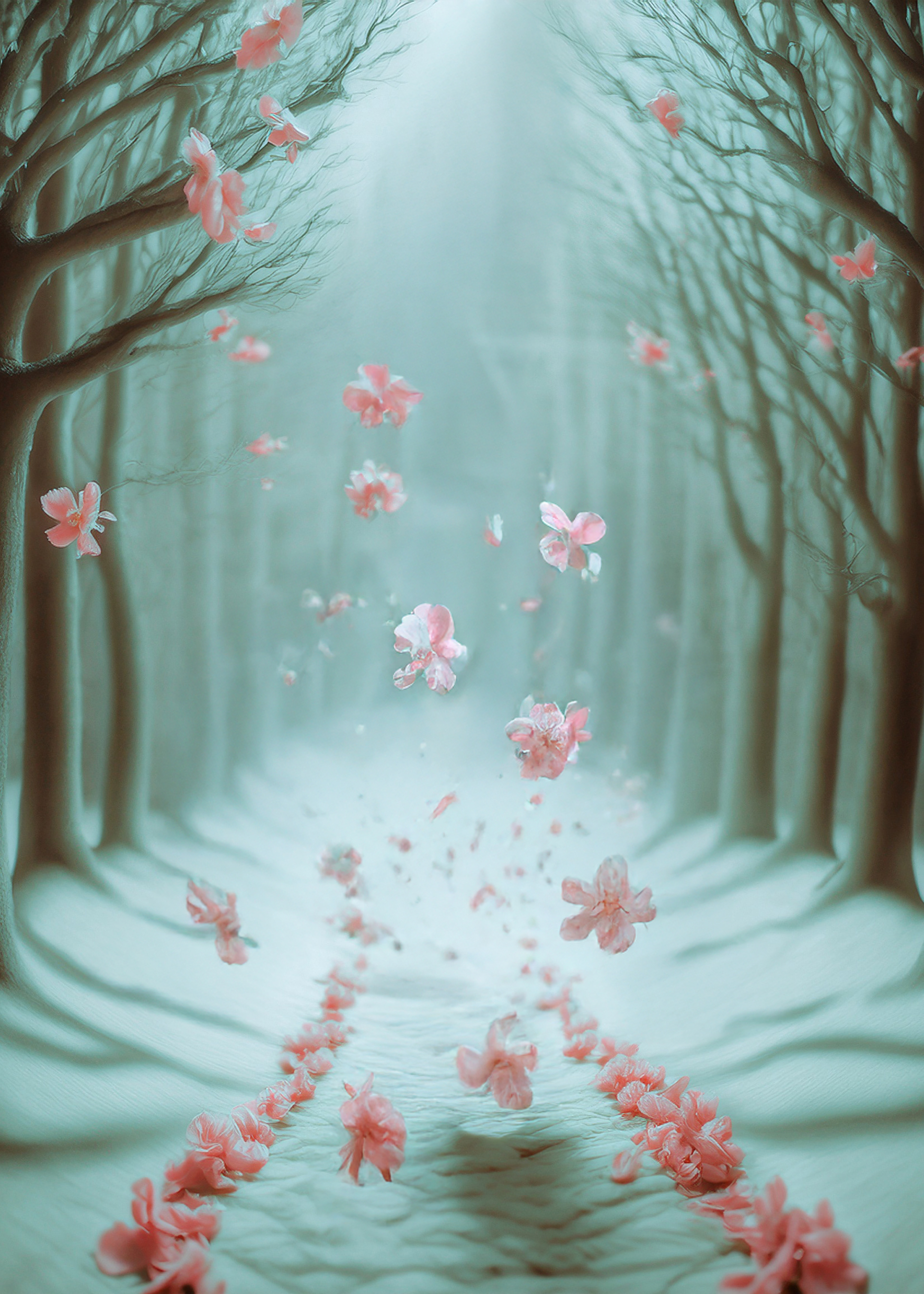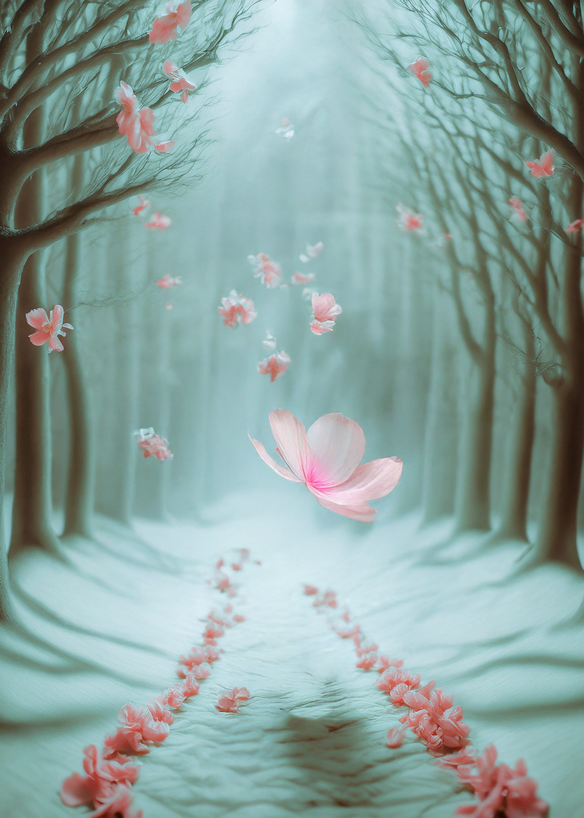 (petals in air, corridor-forest, suspended descent)