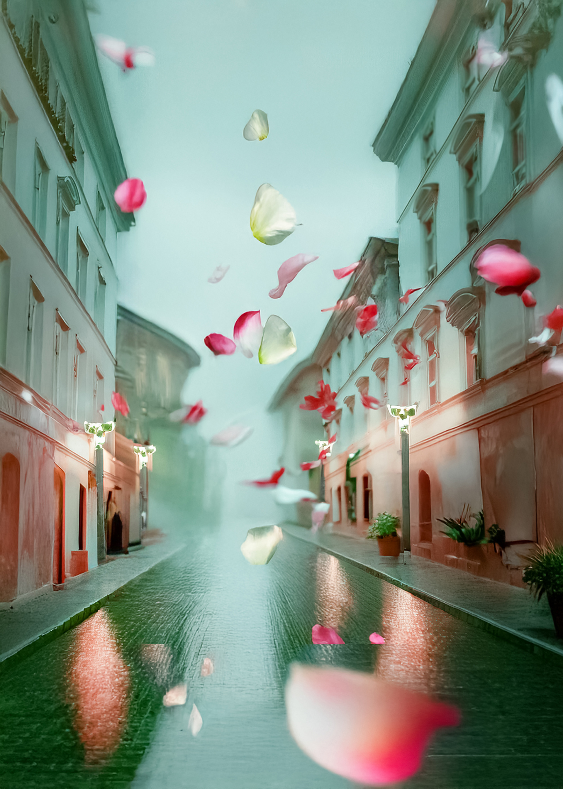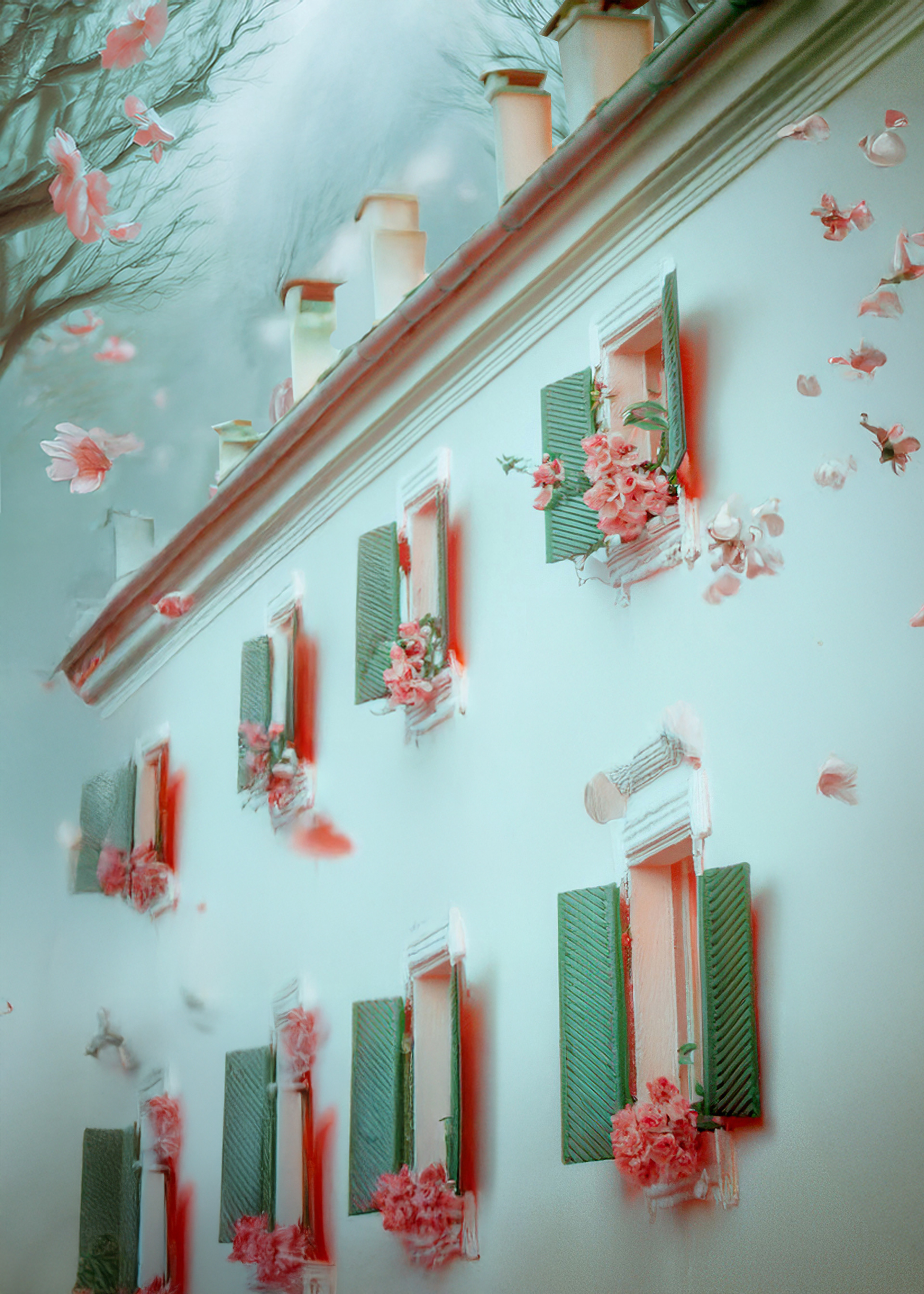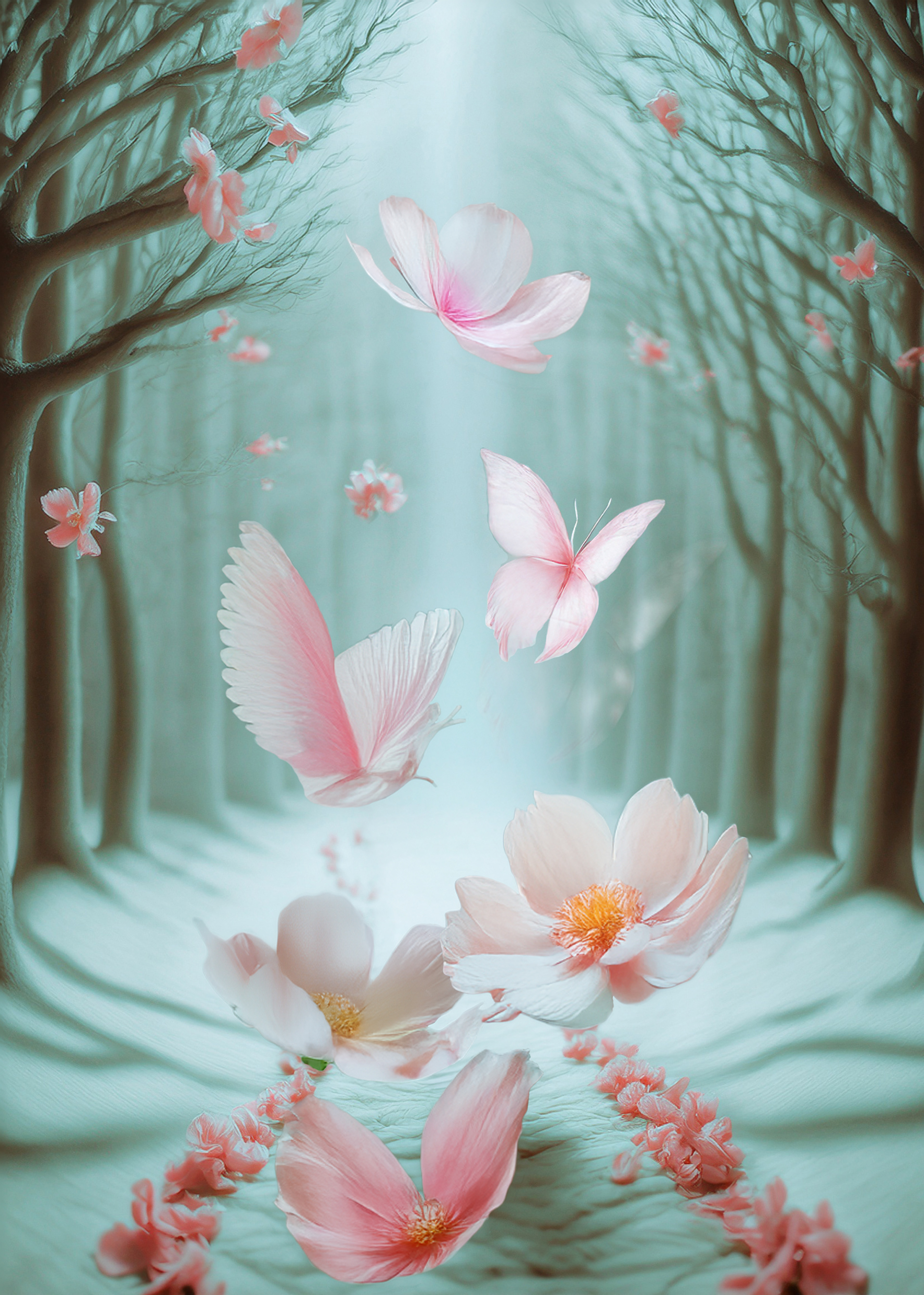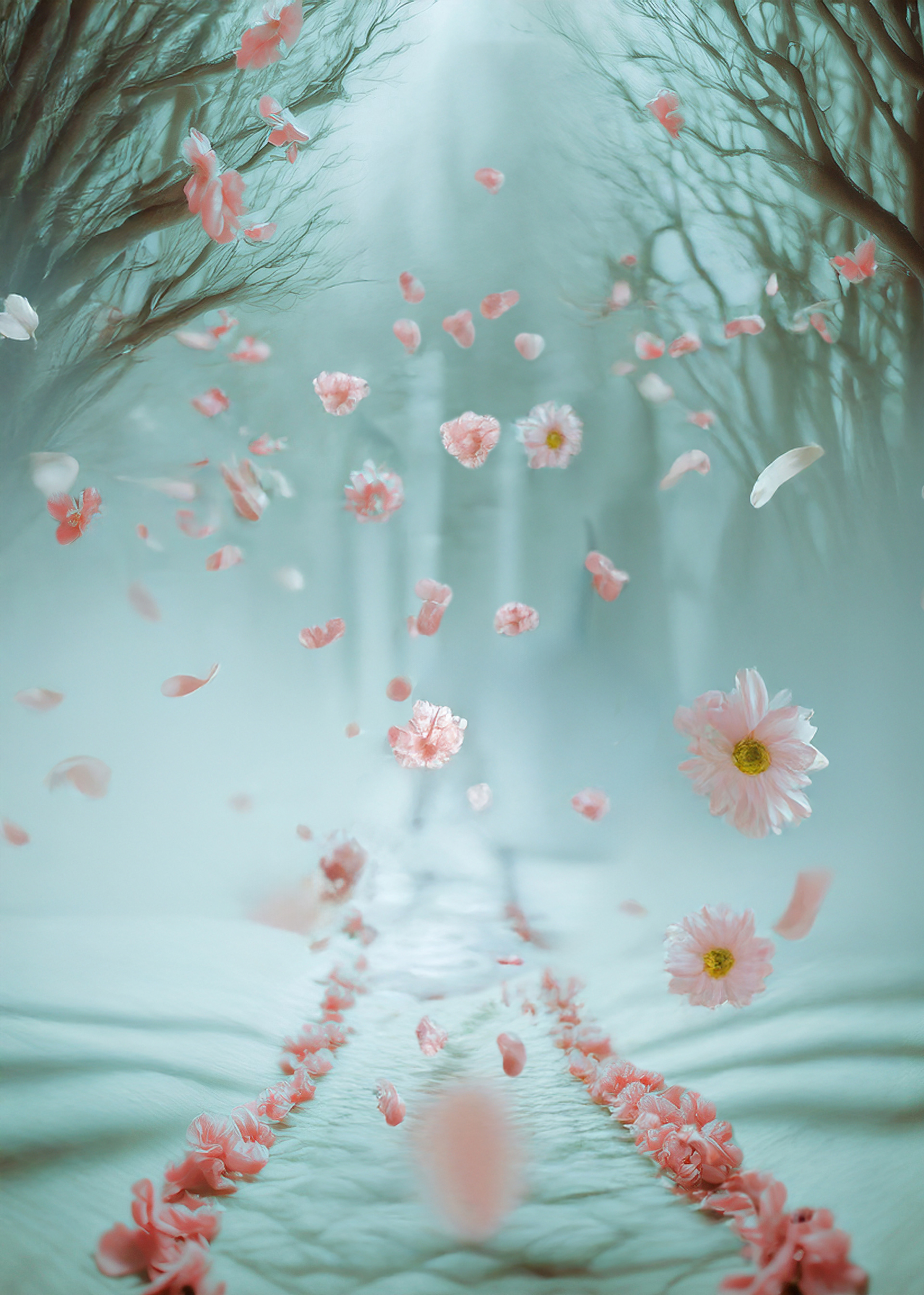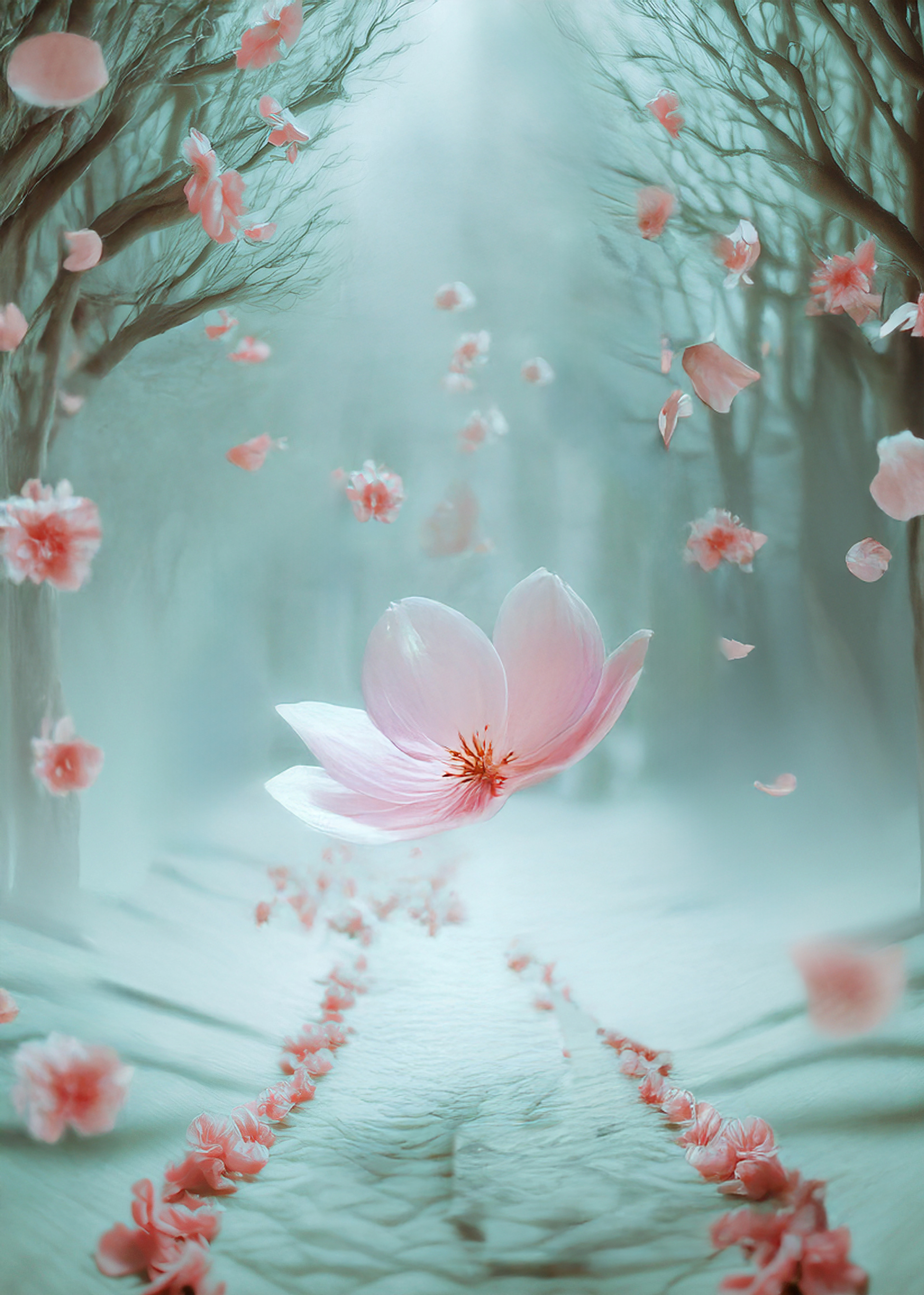 (petals in air, corridor-forest, suspended descent)