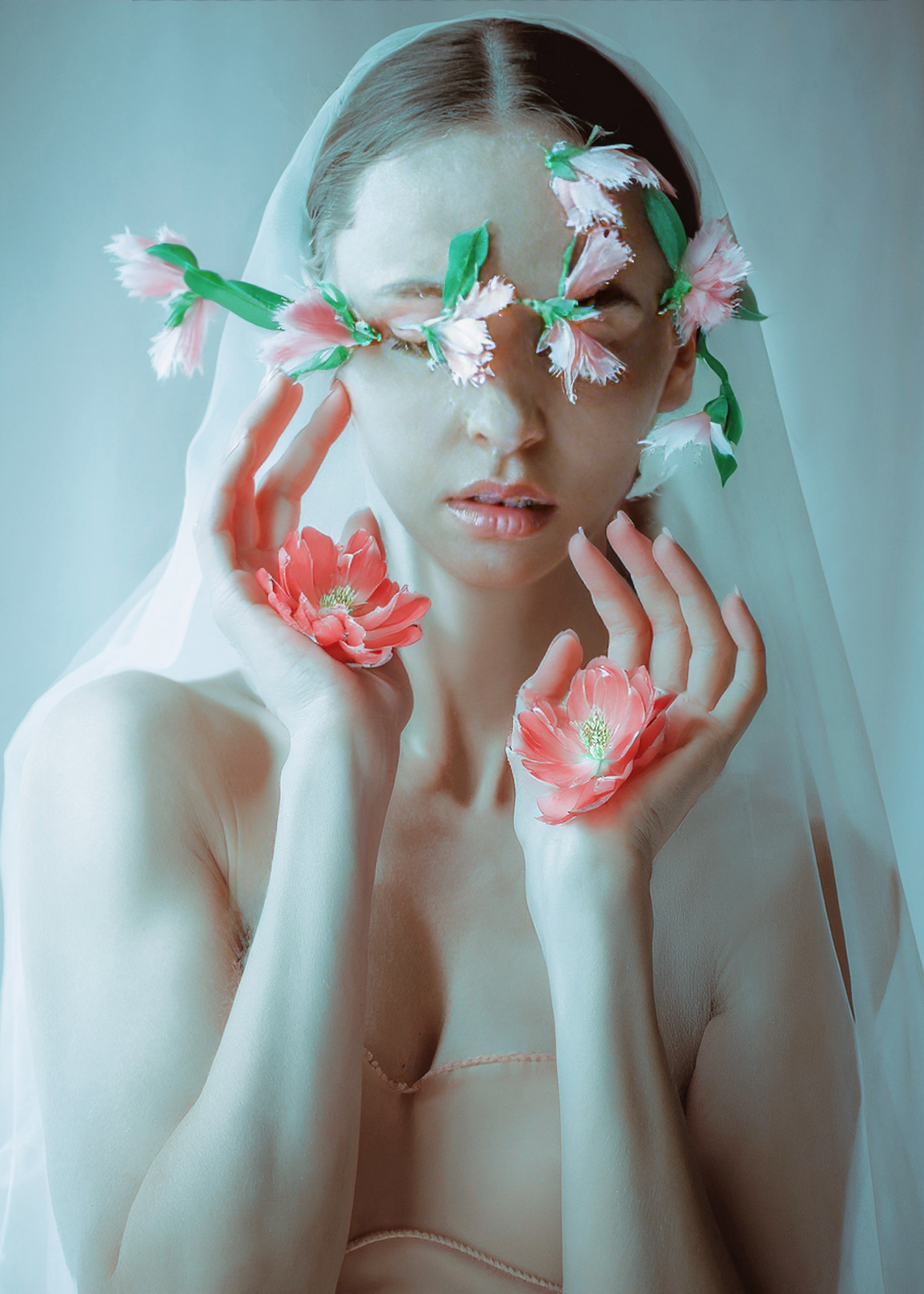 (veiled figures, flowers over eyes, touch as vow)