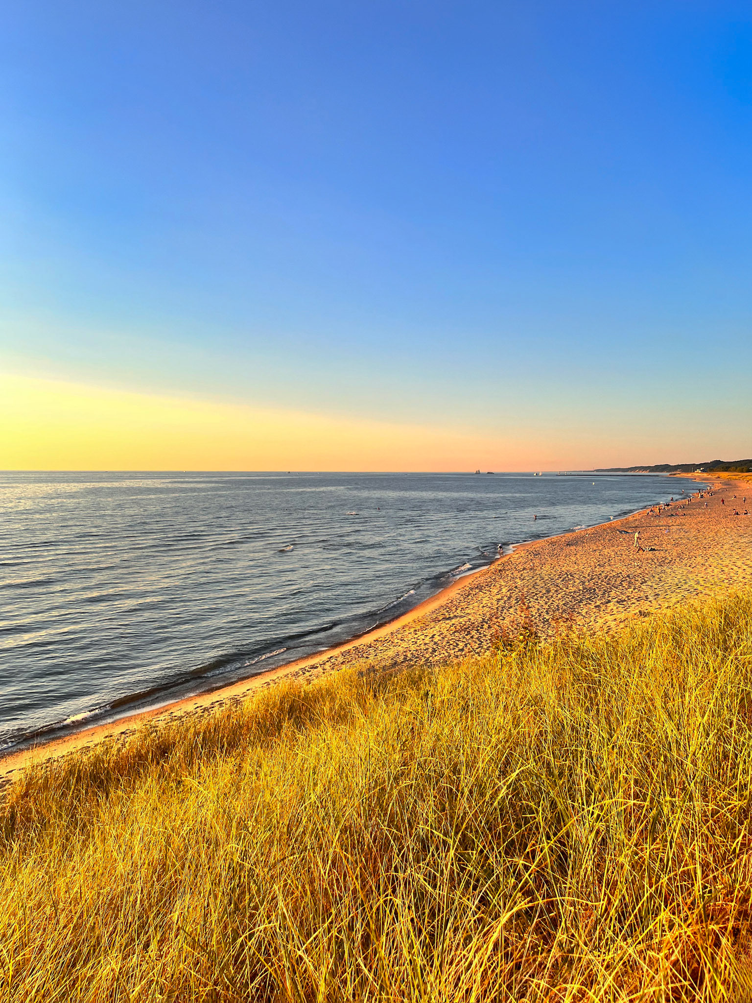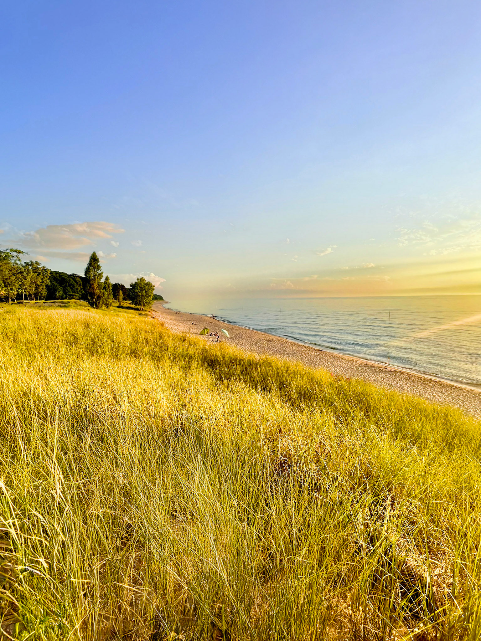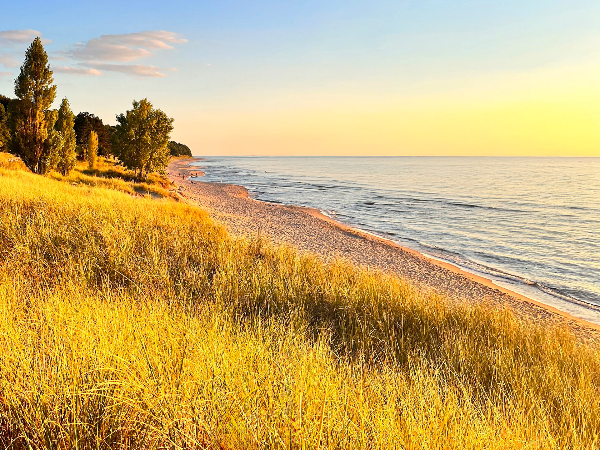 At sunset, the beach performs its quiet miracle. The day drops its brilliance and becomes something more diffused, more fragile. Pastels seep across the lake like dye in silk—lavender, lilac, soft rose—met by the deep-burning oranges and yellows that hover at the lip of the horizon. Some evenings, the colors meet cleanly; on others, they tangle and swirl into improbable gradients that no photograph, however careful, can fully hold. The dunes take on a warm glow, and the green of midsummer foliage becomes satin-smooth, almost weightless. Time slows here; it doesn’t vanish, but it rearranges itself into something more bearable.
