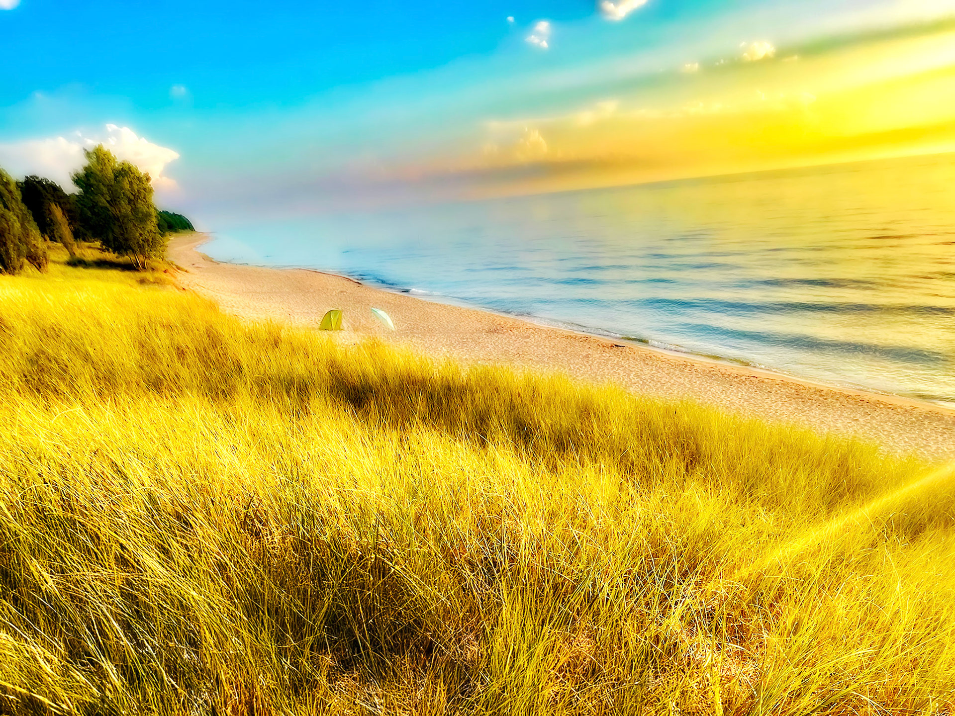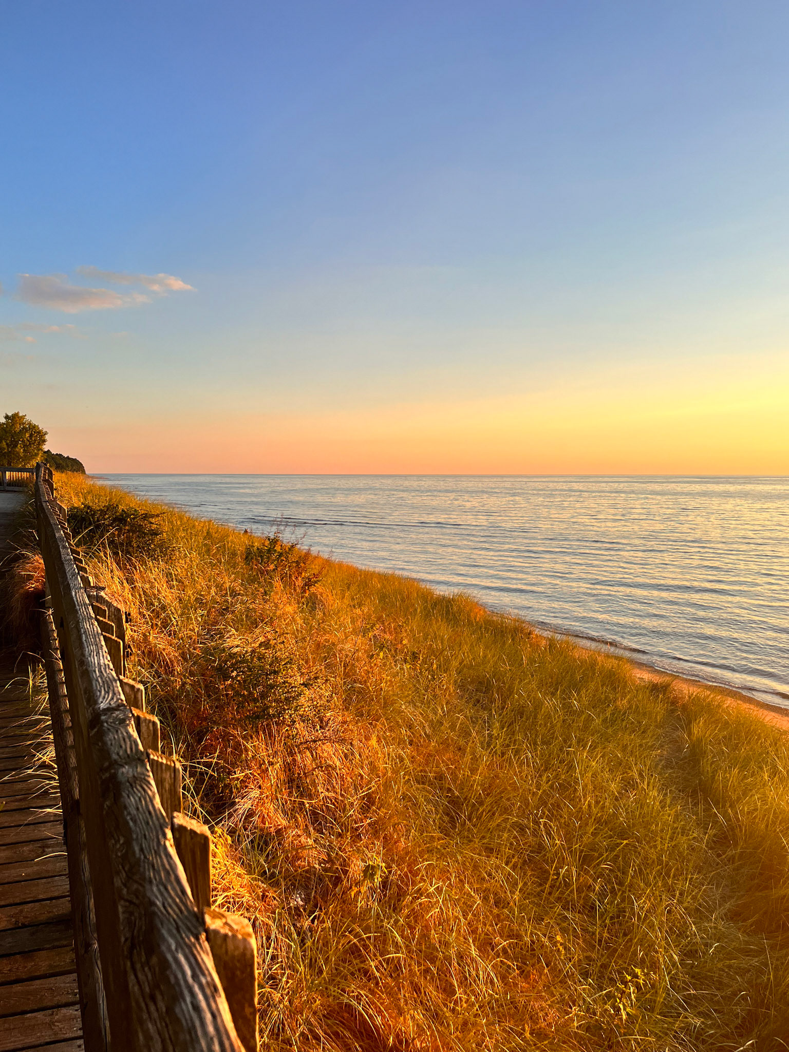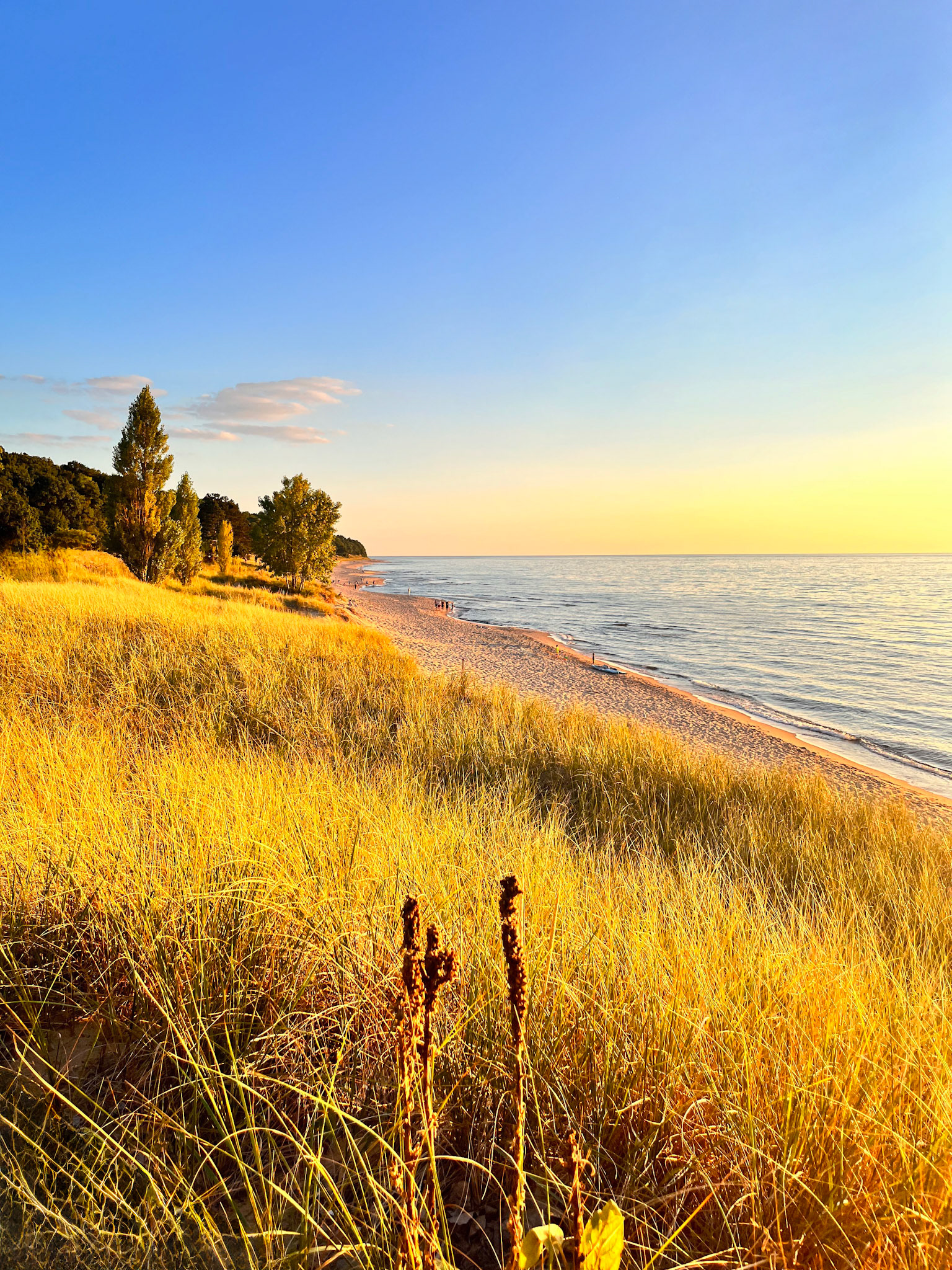At sunset, the beach performs its quiet miracle. The day drops its brilliance and becomes something more diffused, more fragile. Pastels seep across the lake like dye in silk—lavender, lilac, soft rose—met by the deep-burning oranges and yellows that hover at the lip of the horizon. Some evenings, the colors meet cleanly; on others, they tangle and swirl into improbable gradients that no photograph, however careful, can fully hold. The dunes take on a warm glow, and the green of midsummer foliage becomes satin-smooth, almost weightless. Time slows here; it doesn’t vanish, but it rearranges itself into something more bearable.