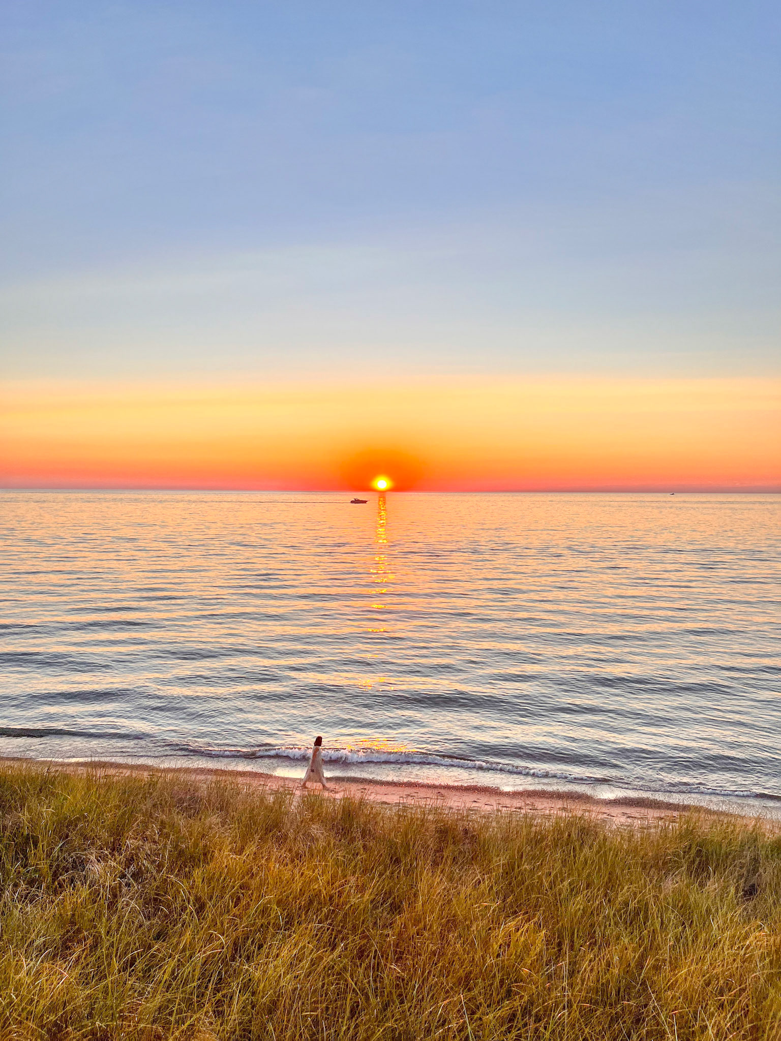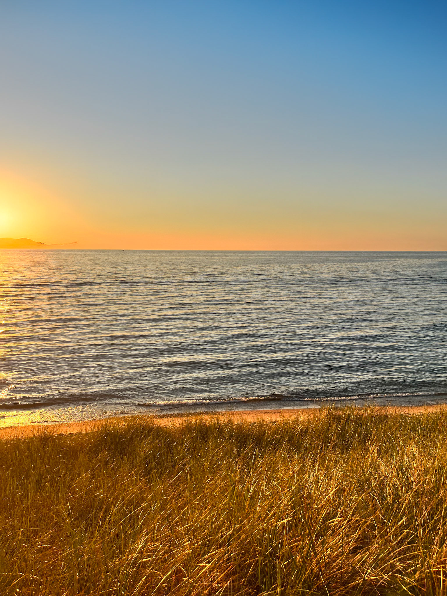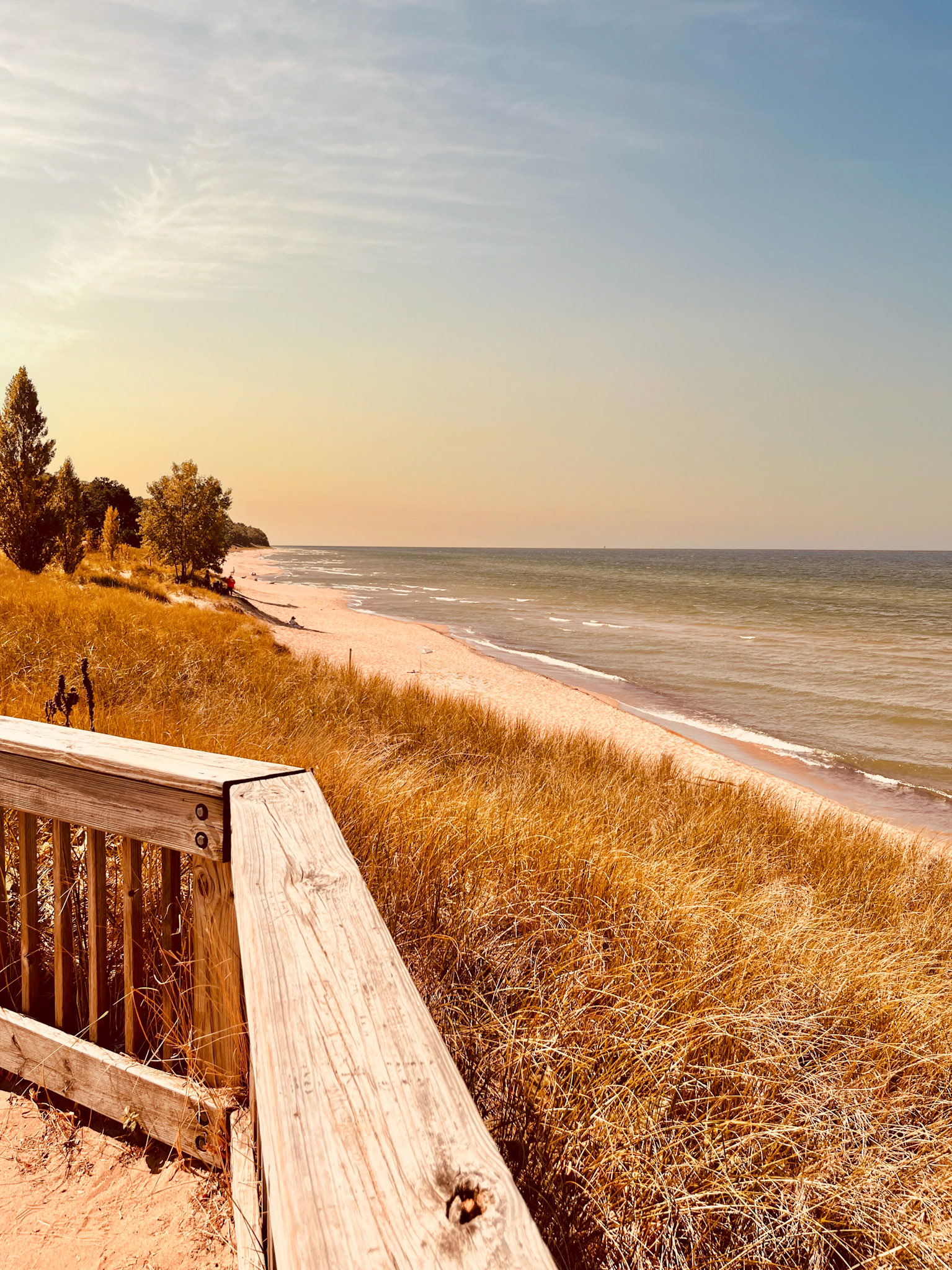 But everything in Saugatuck leads, eventually, to the water. And if the town is the prologue, Oval Beach is the revelation. The path to it curves through trembling dune grass and a sweep of open sky, the lake appearing not all at once but the way a secret reveals itself—slowly, deliberately, invitingly. When you finally crest the sand, there’s a moment in which the world seems to fall away. The lake is enormous but tender; the wind arrives soft, as if carrying a memory; the light itself begins to behave in ways that feel somehow personal.