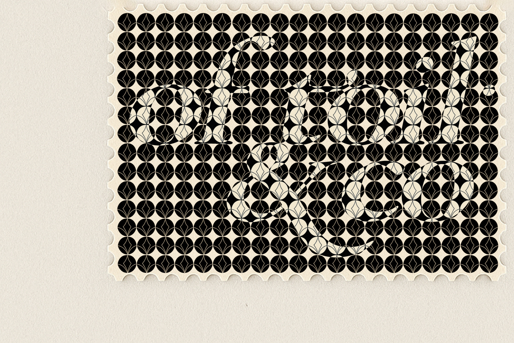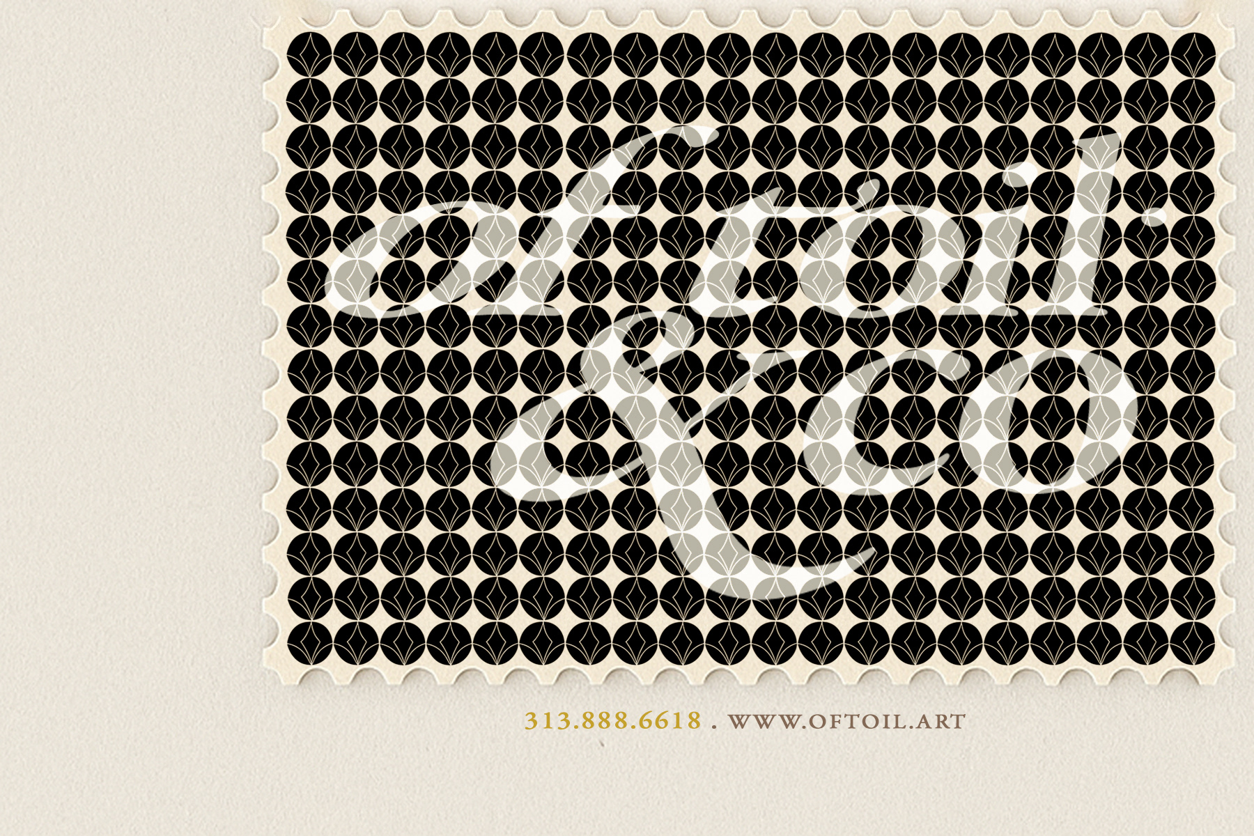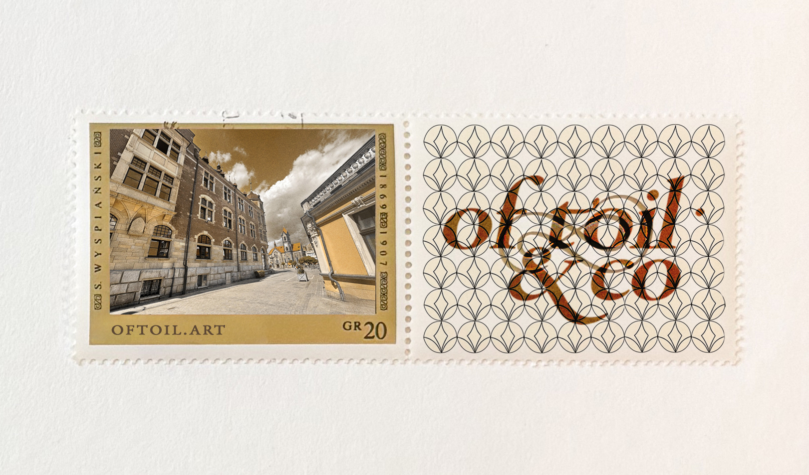 Each stamp is produced as a micro-emblem of the studio: one featuring a geometric lattice interwoven with the OfToil logotype; the other presenting a tinted architectural vignette, rendered like a historical philatelic issue.