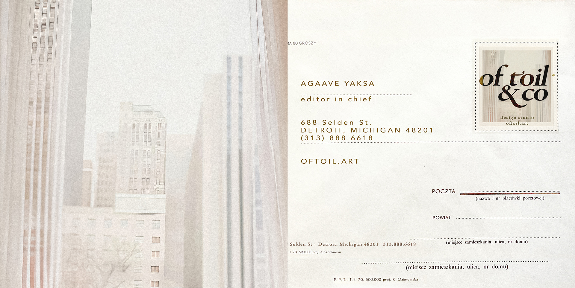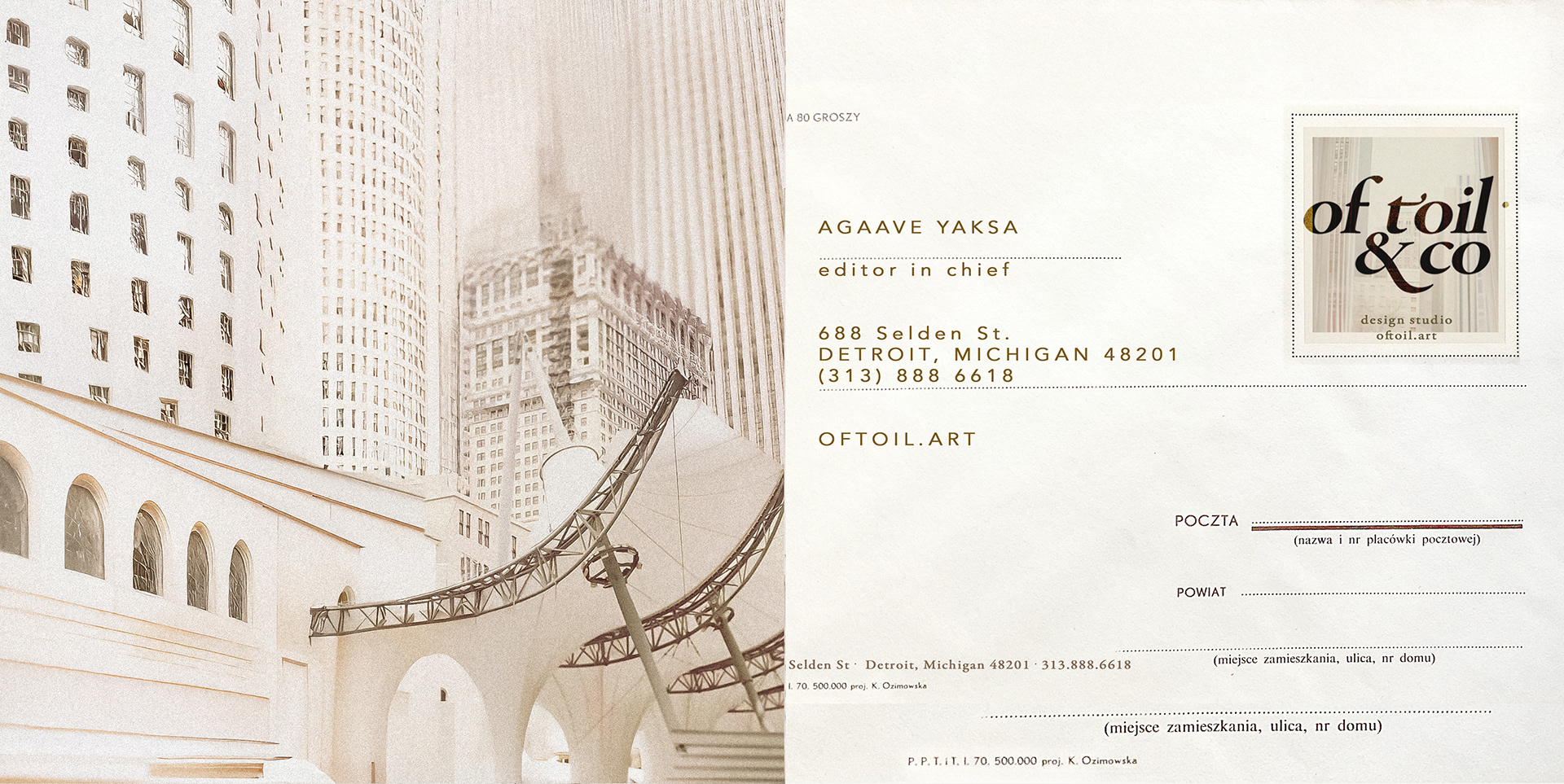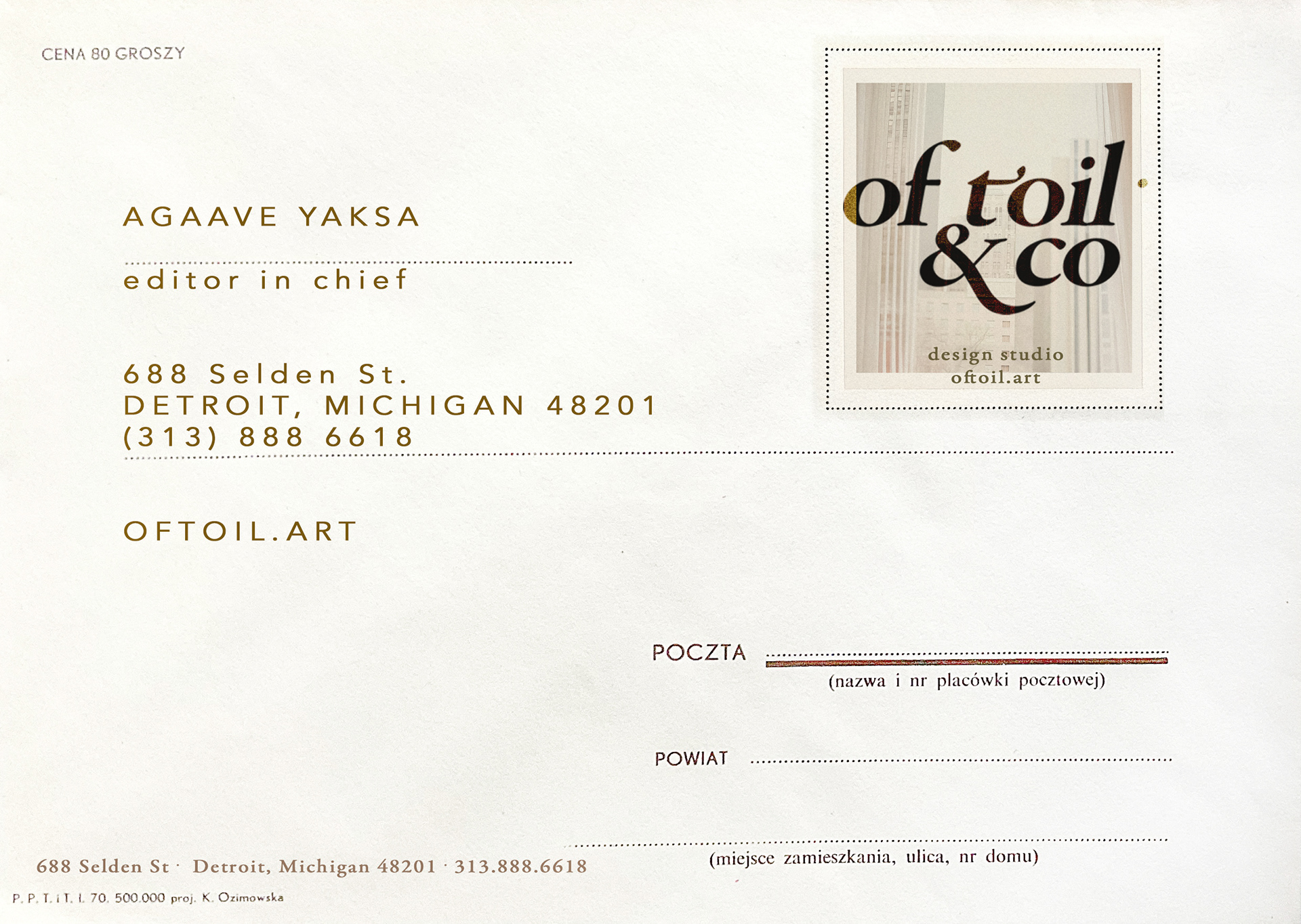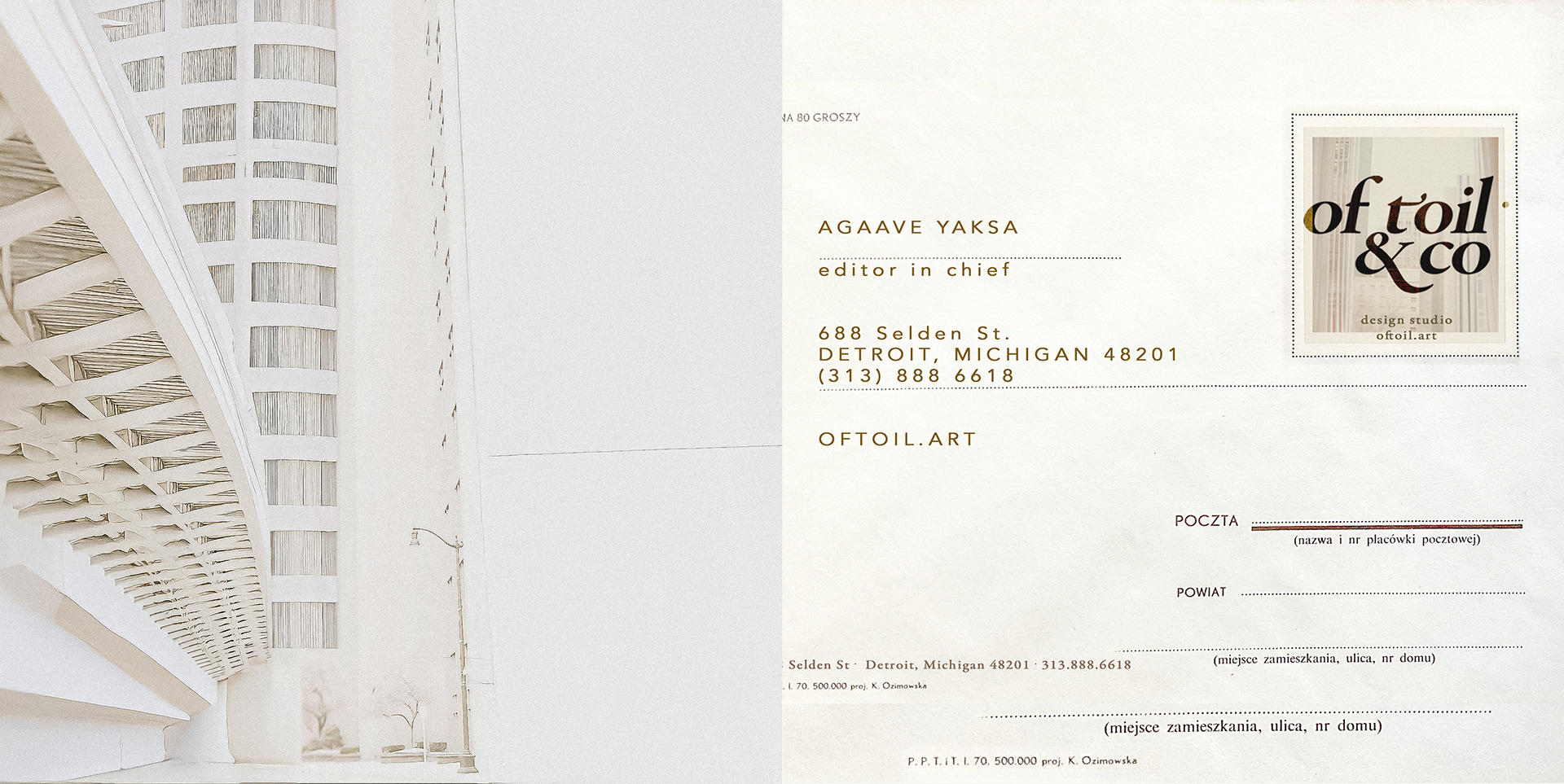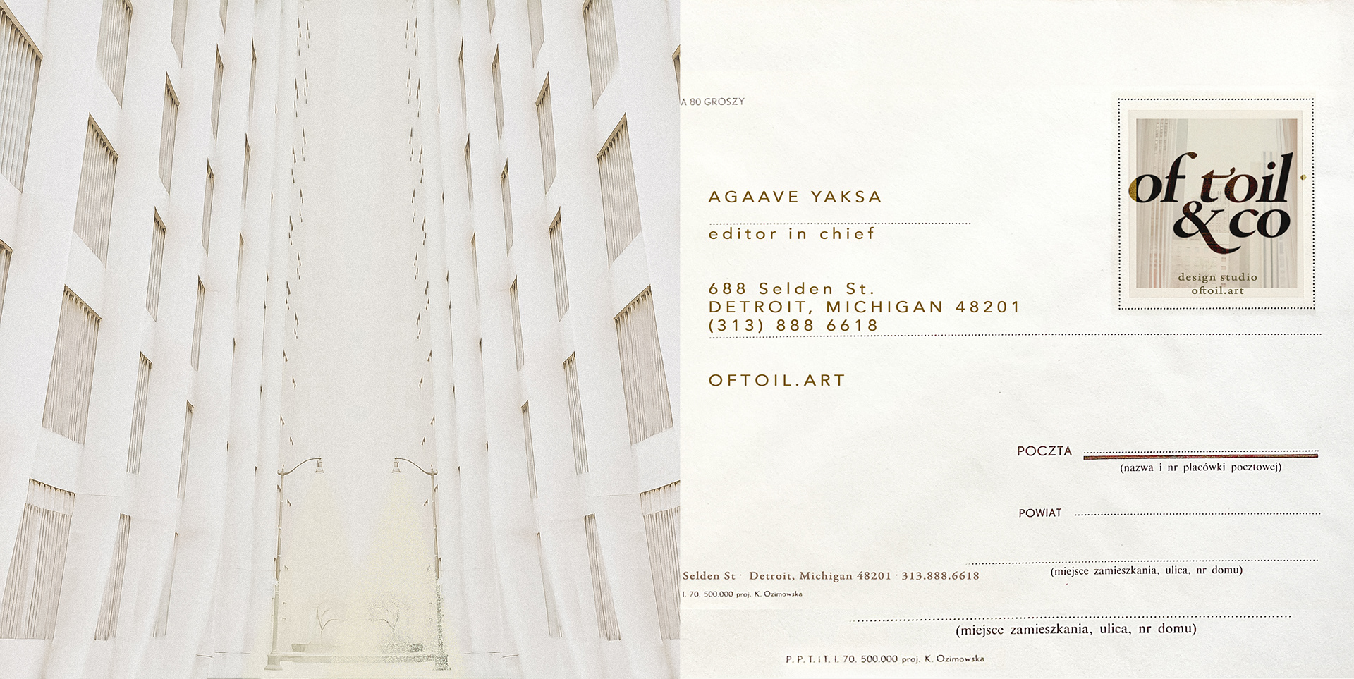 The envelopes carry the quiet authority of mid-century Polish post—cream paper stock, minimal linework, and the OfToil & Co monogram stamped on the sealing fold like a discreet insignia.