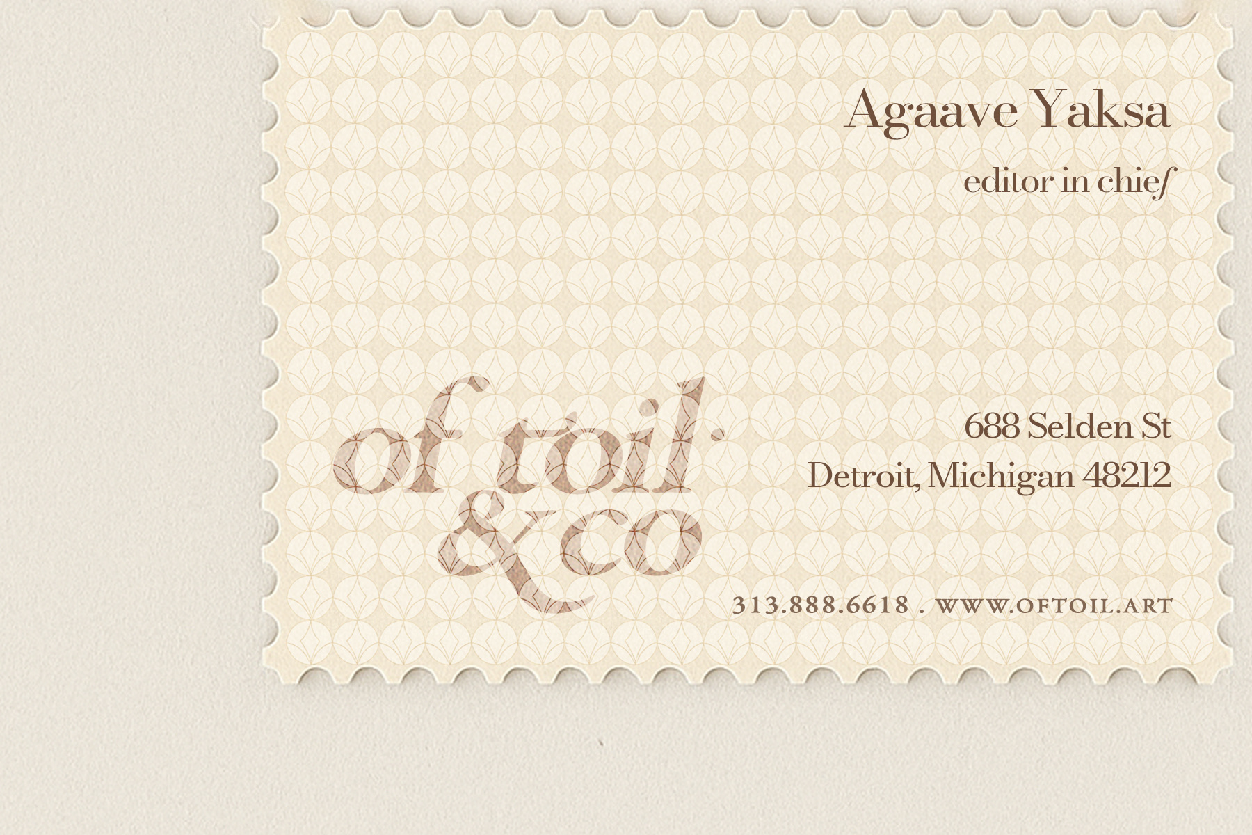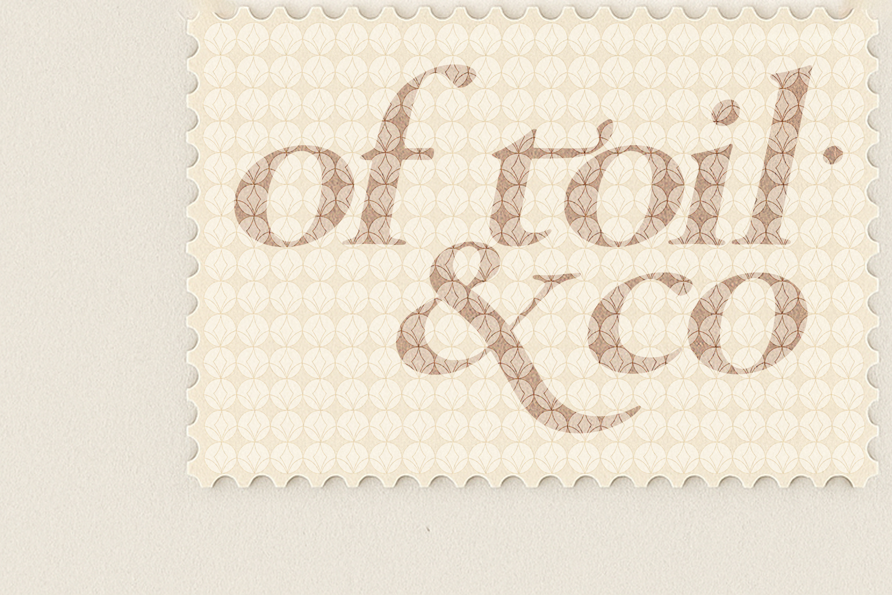 Each variant features scalloped edges, a custom perforation profile, and the repeating OfToil sigil pattern printed in soft mineral tones. Typography is set with the same care as a letterpress edition—precise, serifed, and gently weighted.