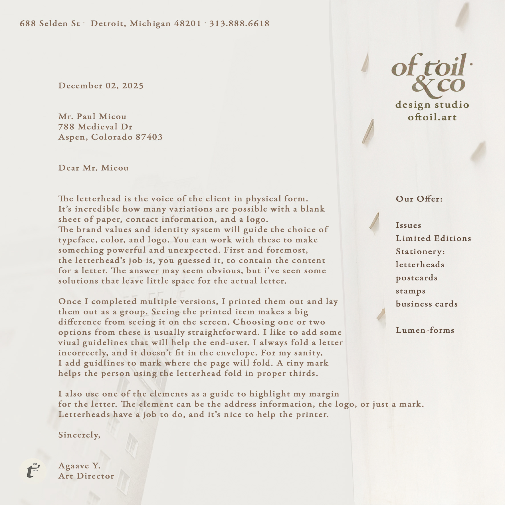 Fronts and backs are available in several compositional layouts, allowing the recipient to experience OfToil as both a name and a mark of authorship.