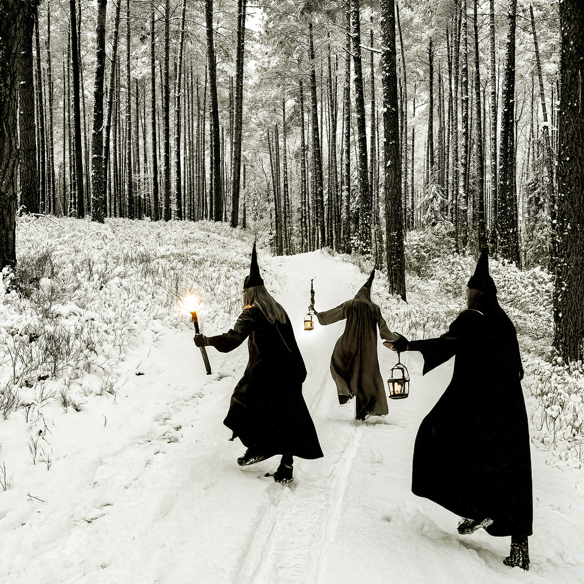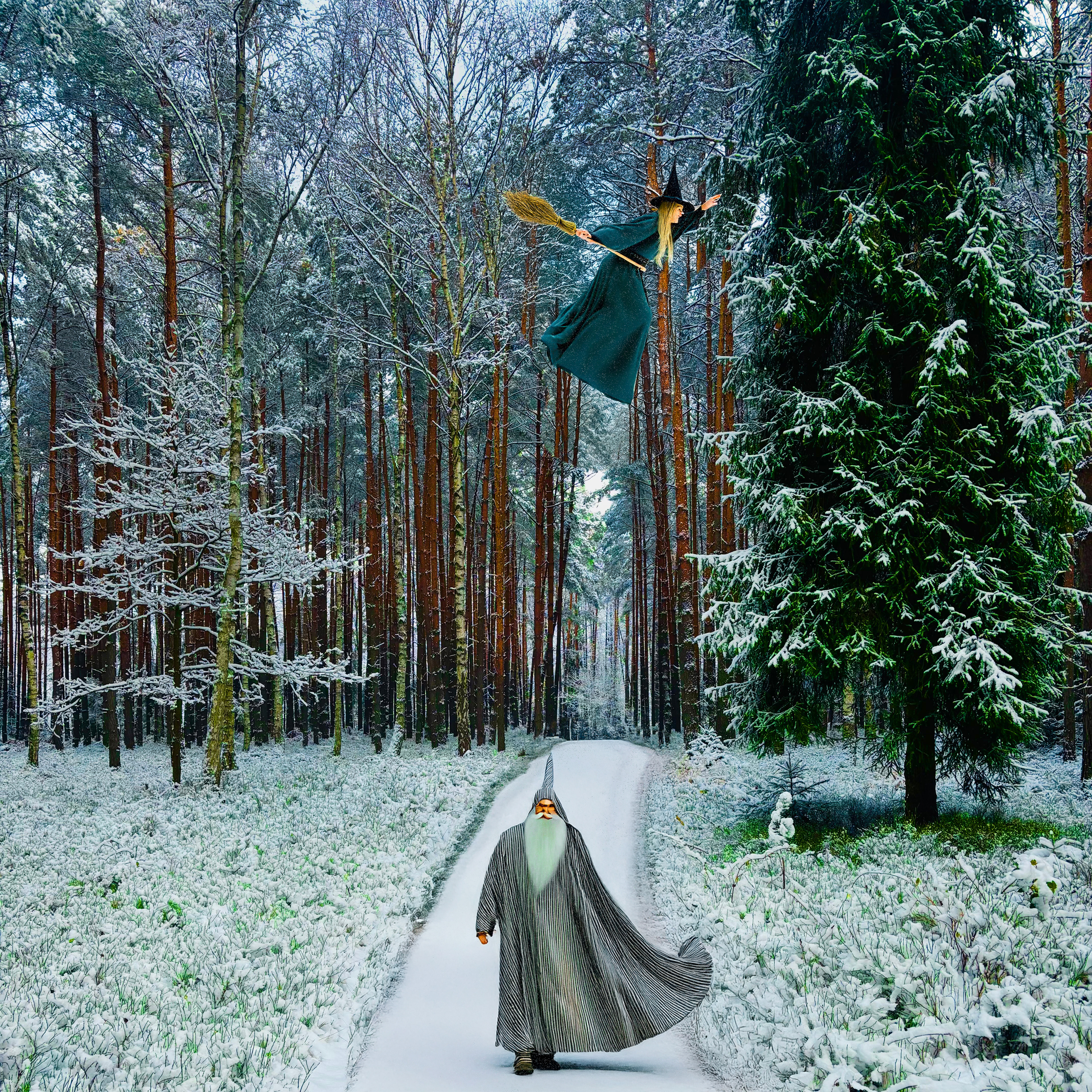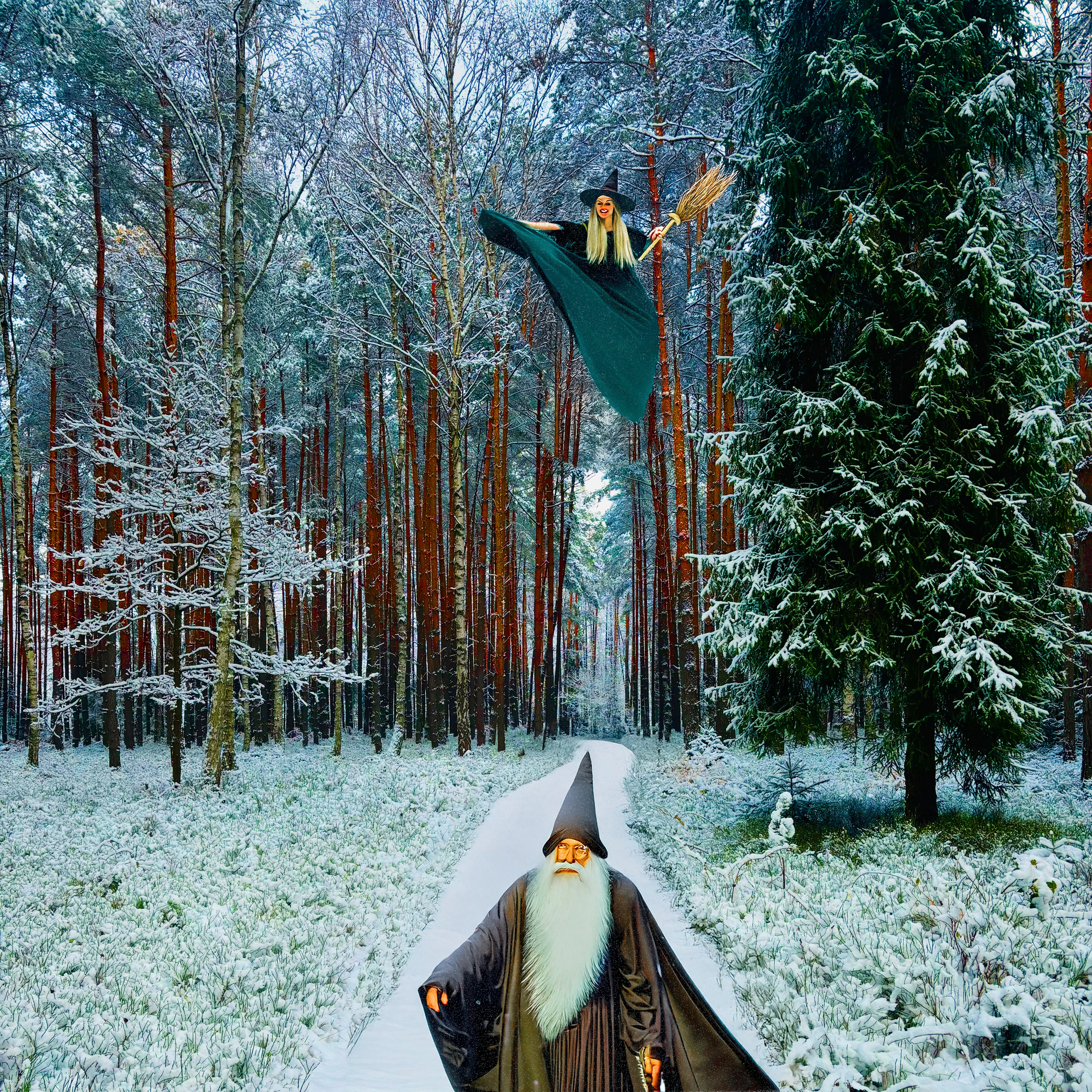High above, two wizards and their witch companions hovered among the treetops, their cloaks flickering between the hues of dusk and dawn. From their brooms, they whispered incantations that drifted like mist, weaving unseen threads through the night air. Where their words touched, the snow stirred and sighed—as if the forest itself remembered its name.
