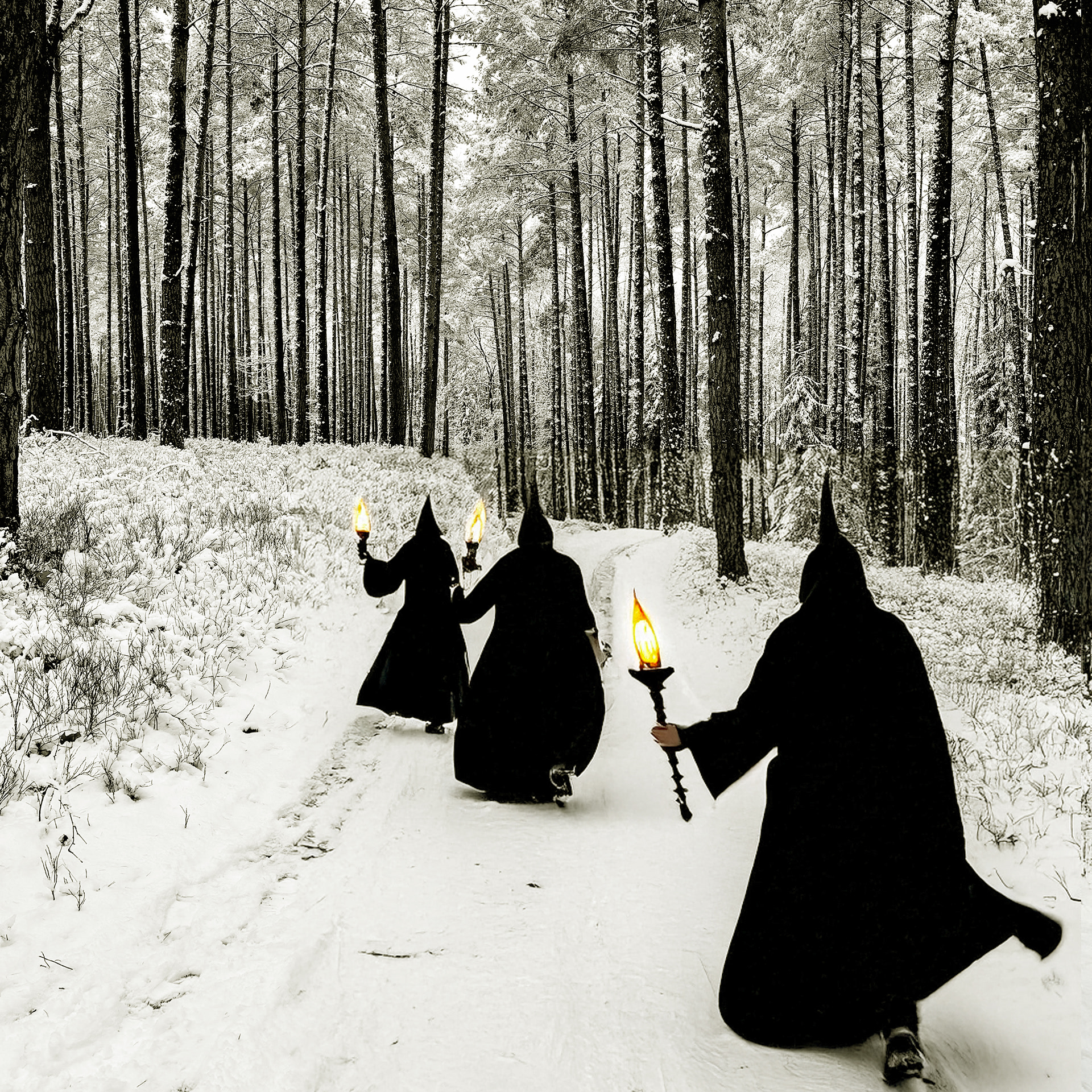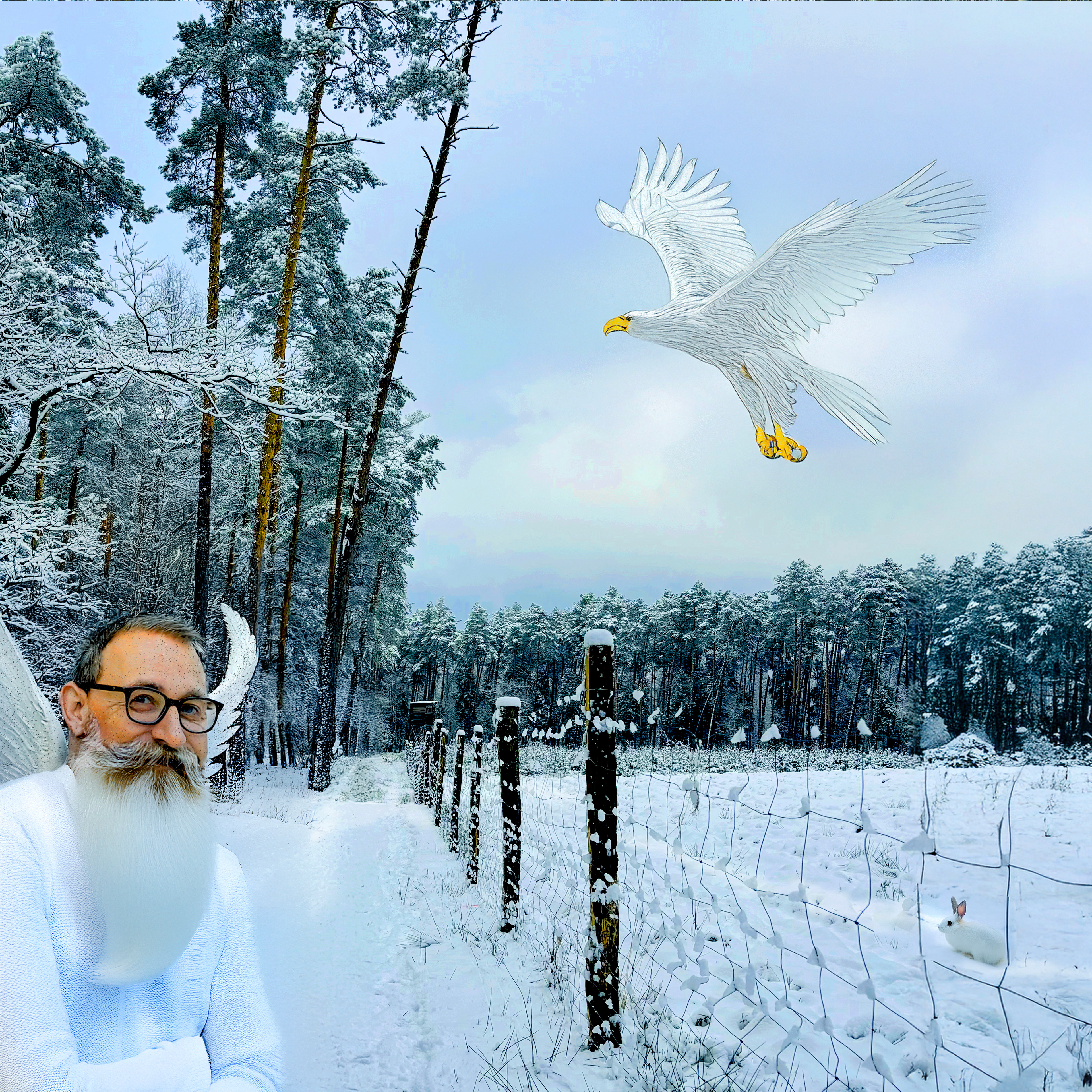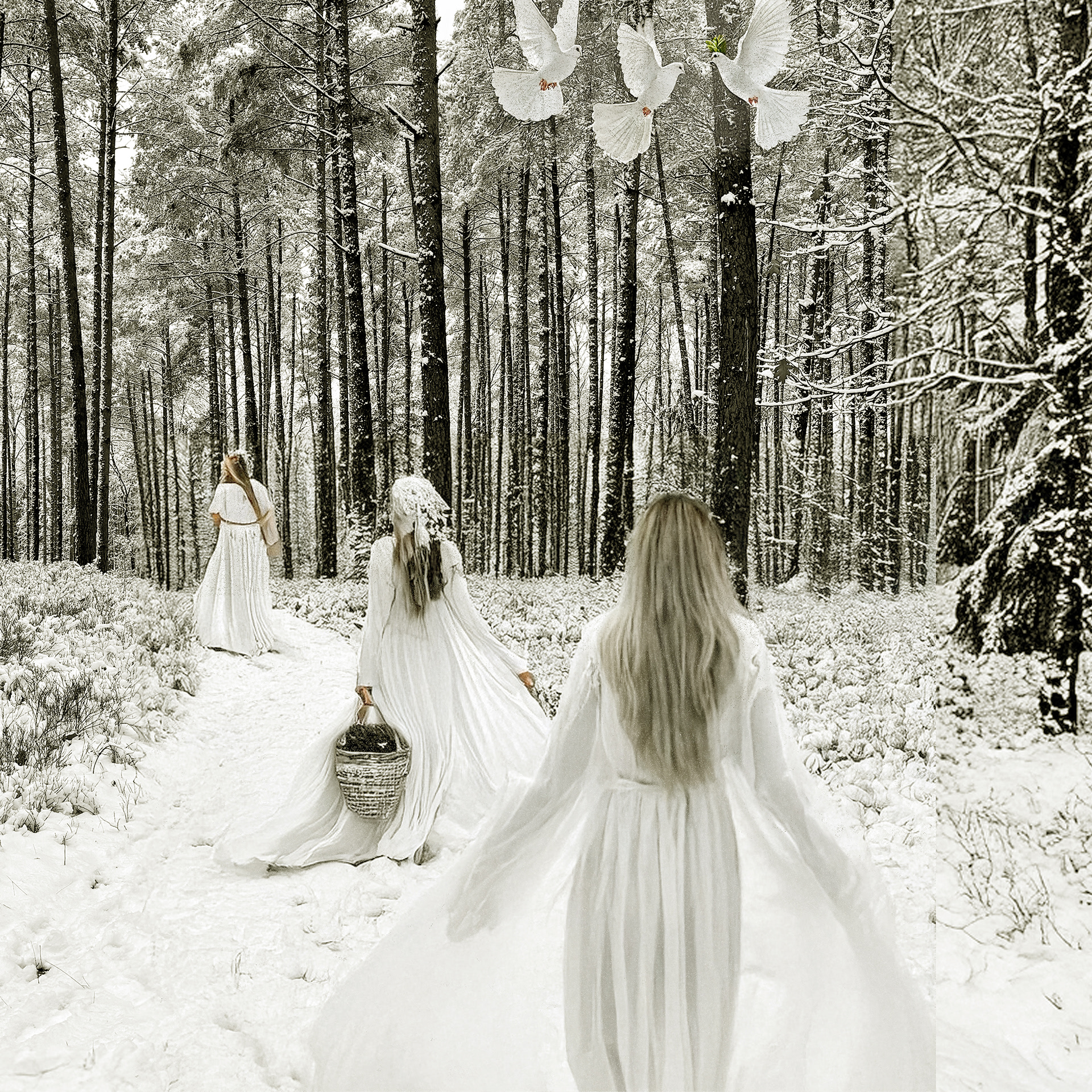 In a forest draped in winter’s hush, ancient figures and fleeting spirits converge. Hooded Druids carry torchlight through snow-laden trees, witches and wizards stir the air above the branches, virgins walk beneath hovering doves, twin boys chase white rabbits, and an eagle watches over them all. At the gathering’s heart stands an old man with white wings—silent, knowing. Without words they meet; without trace they depart. The forest, itself a character, holds their secret beneath its pillowy clouds of snow.