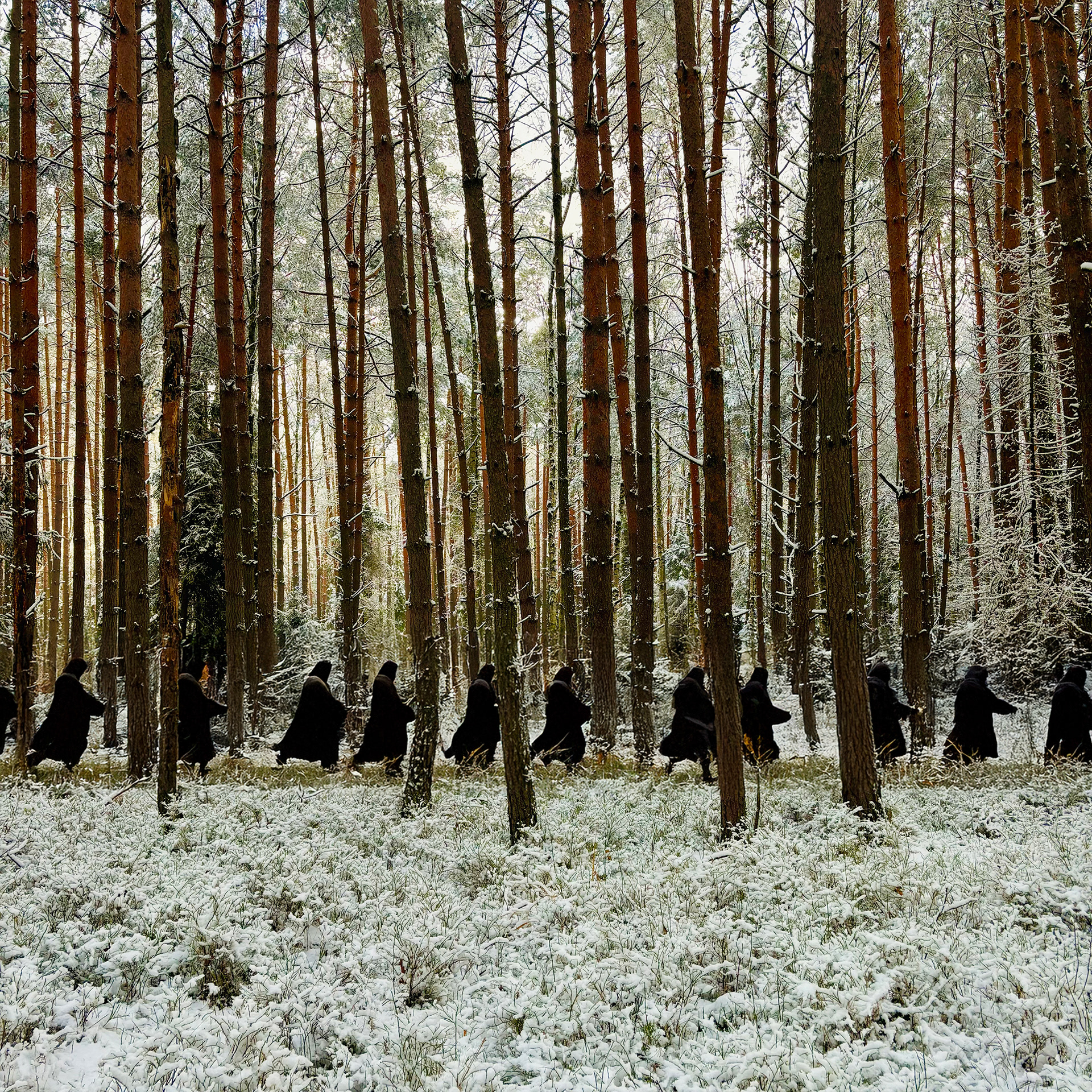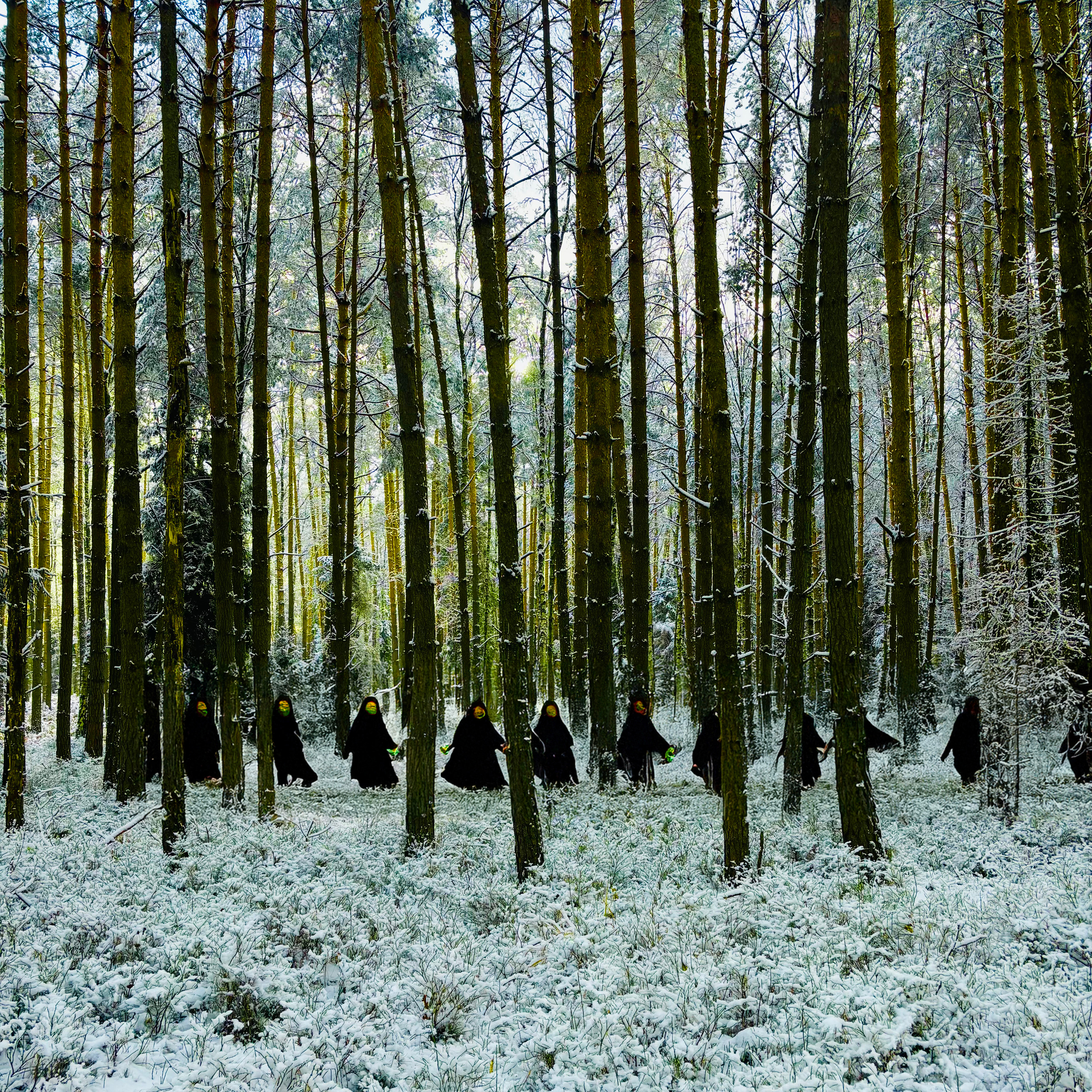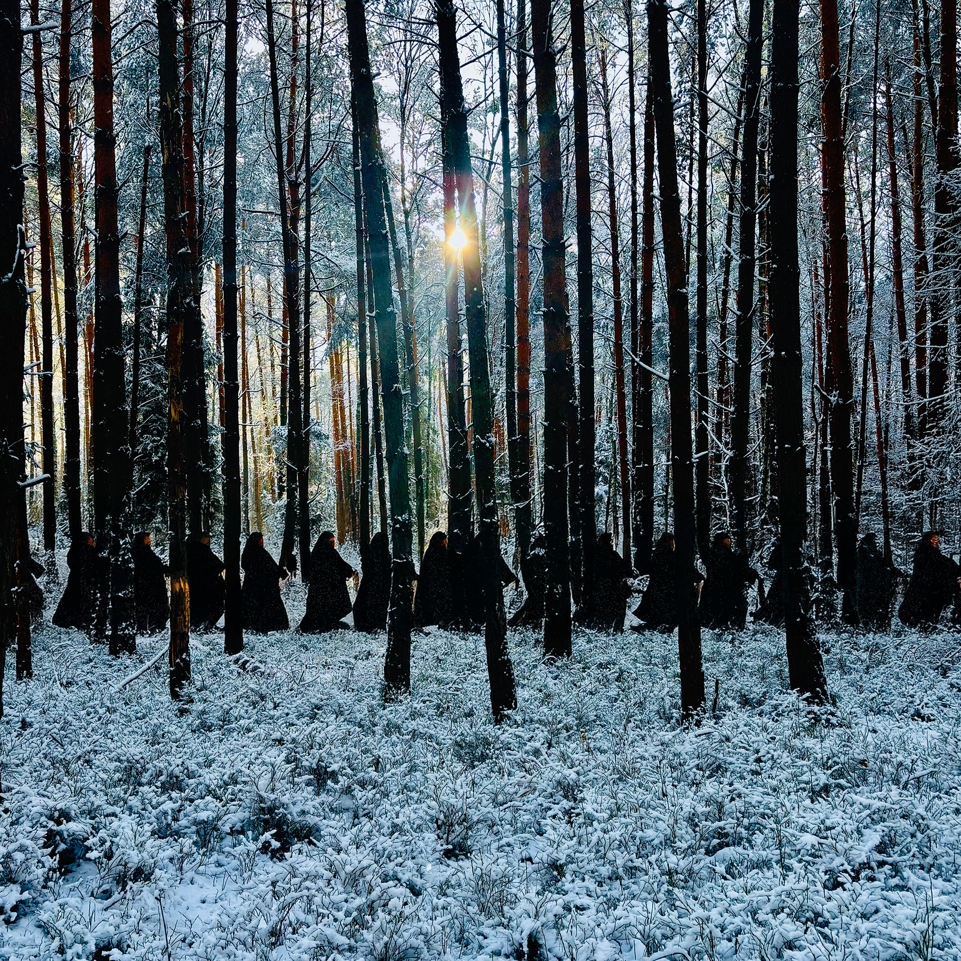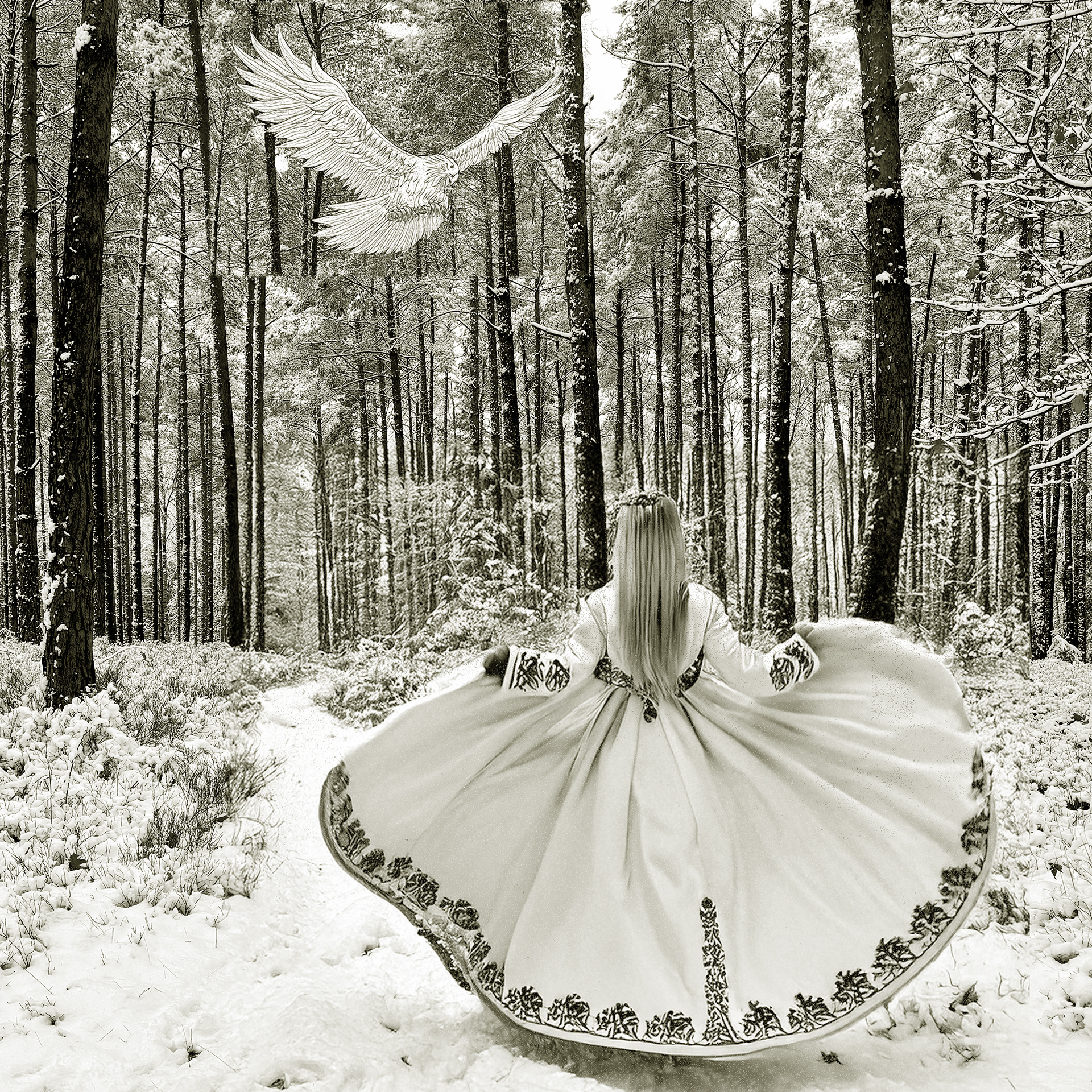 In a forest draped in winter’s hush, ancient figures and fleeting spirits converge. Hooded Druids carry torchlight through snow-laden trees, witches and wizards stir the air above the branches, virgins walk beneath hovering doves, twin boys chase white rabbits, and an eagle watches over them all. At the gathering’s heart stands an old man with white wings—silent, knowing. Without words they meet; without trace they depart. The forest, itself a character, holds their secret beneath its pillowy clouds of snow.